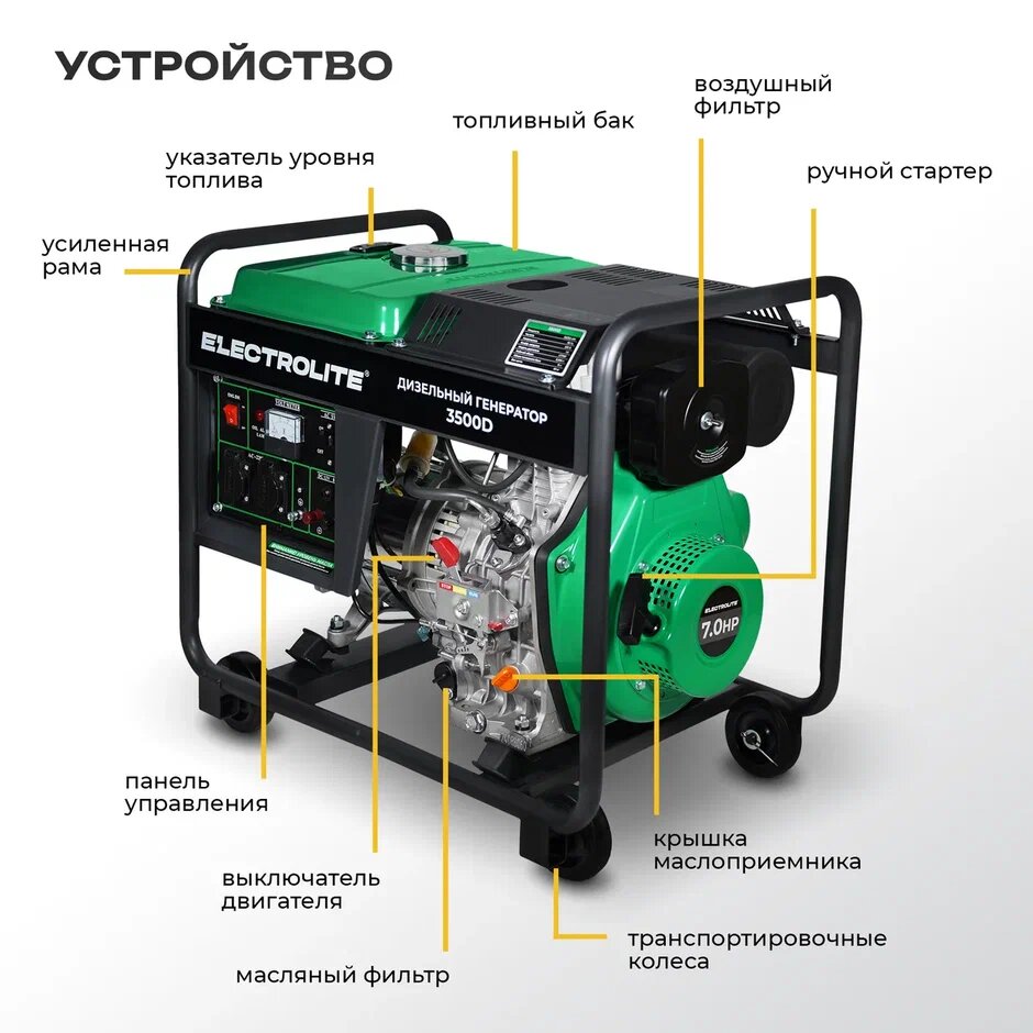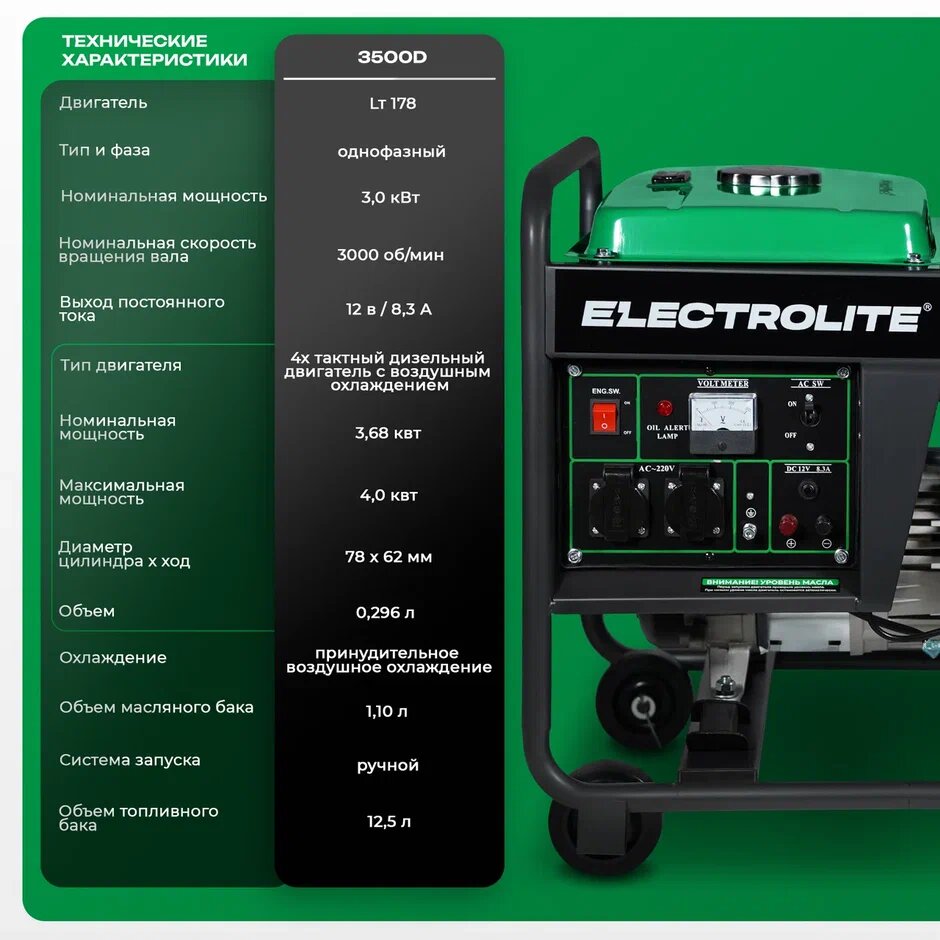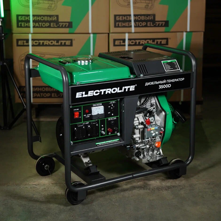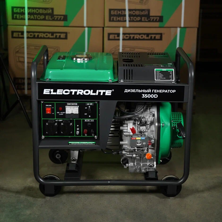 Генератор дизельный / Электрогенератор / Дизельный генератор / Электростанция Electrolite 3500D (4,375 кВа пиковая нагрузка , 220 В / 12 В, 3 / 3,5 кВт, 50 Гц, 7 л.с, ручной стартер )