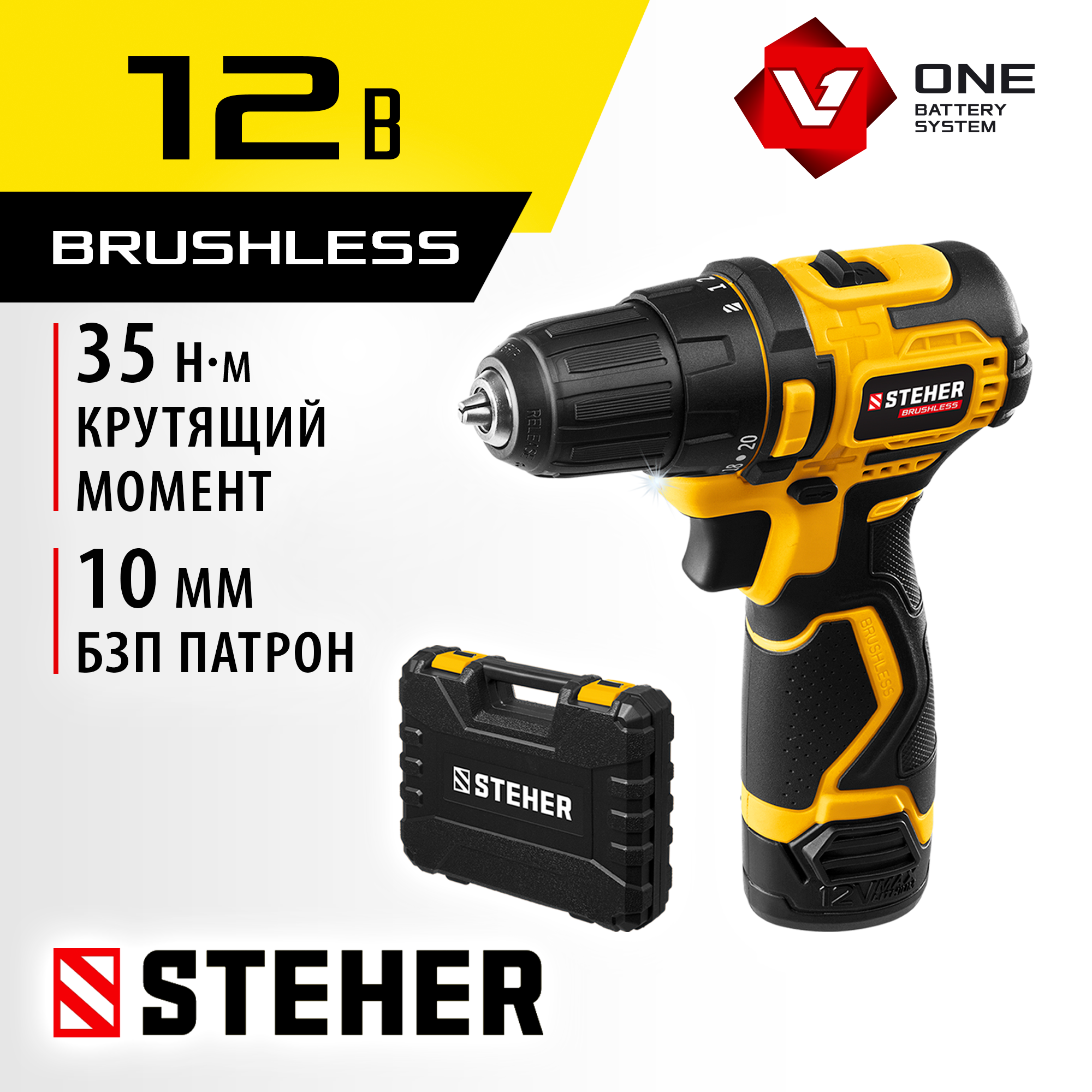 STEHER V1, 20 В, 45 Н·м, 1 АКБ (2 А·ч), бесщеточная дрель-шуруповерт, кейс (CDB-200-1)