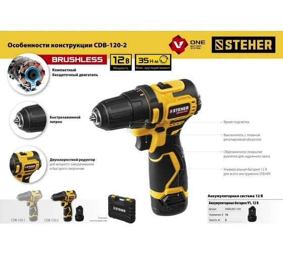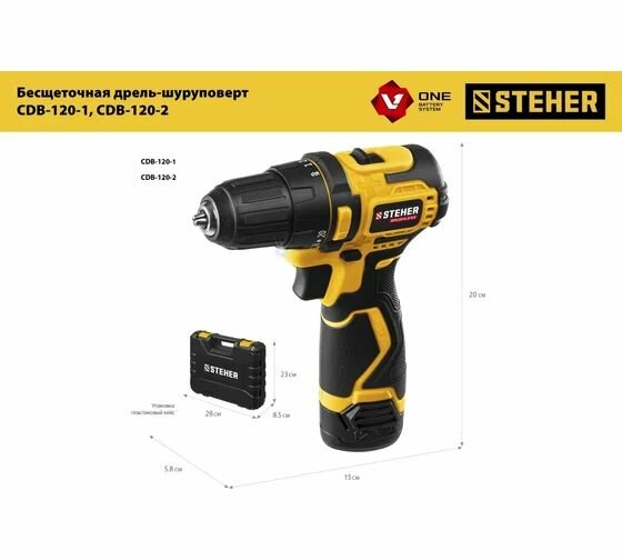 STEHER V1, 20 В, 45 Н·м, 1 АКБ (2 А·ч), бесщеточная дрель-шуруповерт, кейс (CDB-200-1)