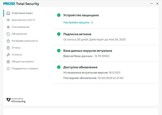 Что касается непосредственно PRO32 Total Security. Мы решили сами протестировать этот продукт. У нас есть специальный тестовый "свисток", а именно Intel Computer Stick, одноплатовый ПК с ооочень скромной конфигурацией: Intel Atom Z3735F 4 ядра 4 потока 1.33 GHz, 2GbRAM, 32Gb eMMC Flash, Win10 x32 на борту. Если софтина встанет и будет работать более или менее адекватно на этом "чуде", то будет работать практически везде =). Напоминаем, что PRO32 построен на движке K7 индийского производителя K7 Computing в мире более 25 миллионов пользователей этого антивируса, это даже больше, чем было у ESET и опыт разработки более 30 лет у K7, по истории они сравнимы с нашими отечественными "зелёными" антивирусами. По производительности независимые тестовые лаборатории AV Comparatives, AV-Test, VB100 - оценивают оч. высоко эти продукты, они в топе и выше по баллам, чем ушедший ESET. Установка PRO32 Total Security русской версии заняла если не меньше, то столько же времени, сколько скачивание её с сайта разработчика. Обновить базы без активации антивирус не дал, было предложено активировать либо пробный период, либо купленную лицензию, мы остановились на триале в 30 дней. Процесс прошёл в несколько кликов без проблем и затыков, не было проблем и при установке. |