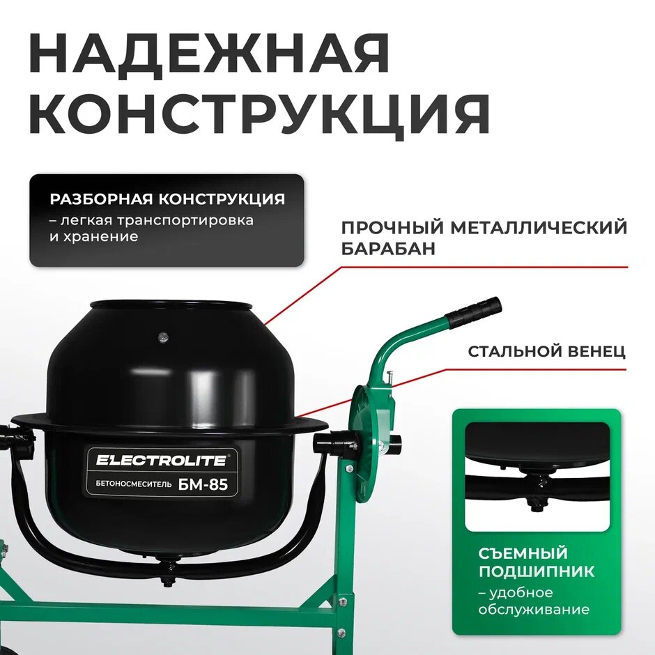 Бетоносмеситель Electrolite БМ-85 ( 85л, 220в, 450Вт, 29,5 об/мин ) интересное: