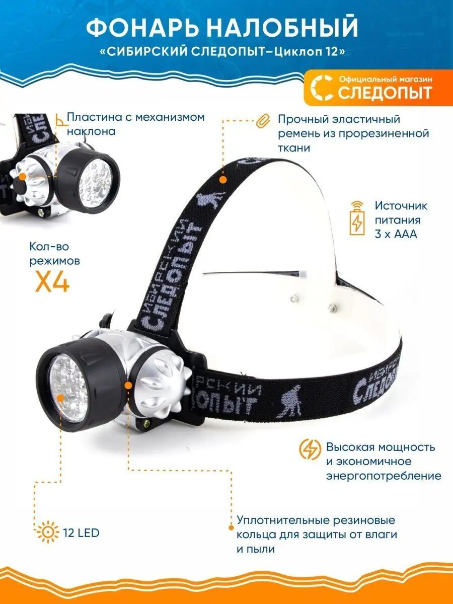 Фонарь налобный "сибирский следопыт-циклоп 12", 12L, 3хААА