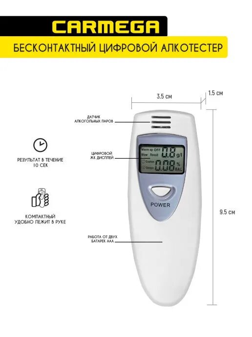 Алкотестер персональный цифровой CARMEGA С LCD экраном на батарейках / Экспресс тест на алкоголь