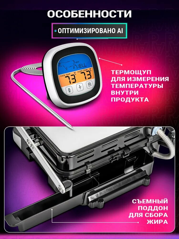Гриль электрический для дома Pioneer с антипригарными панелями и термощупом, 2 рабочих положения антипригарная система 5G, 2000 Вт