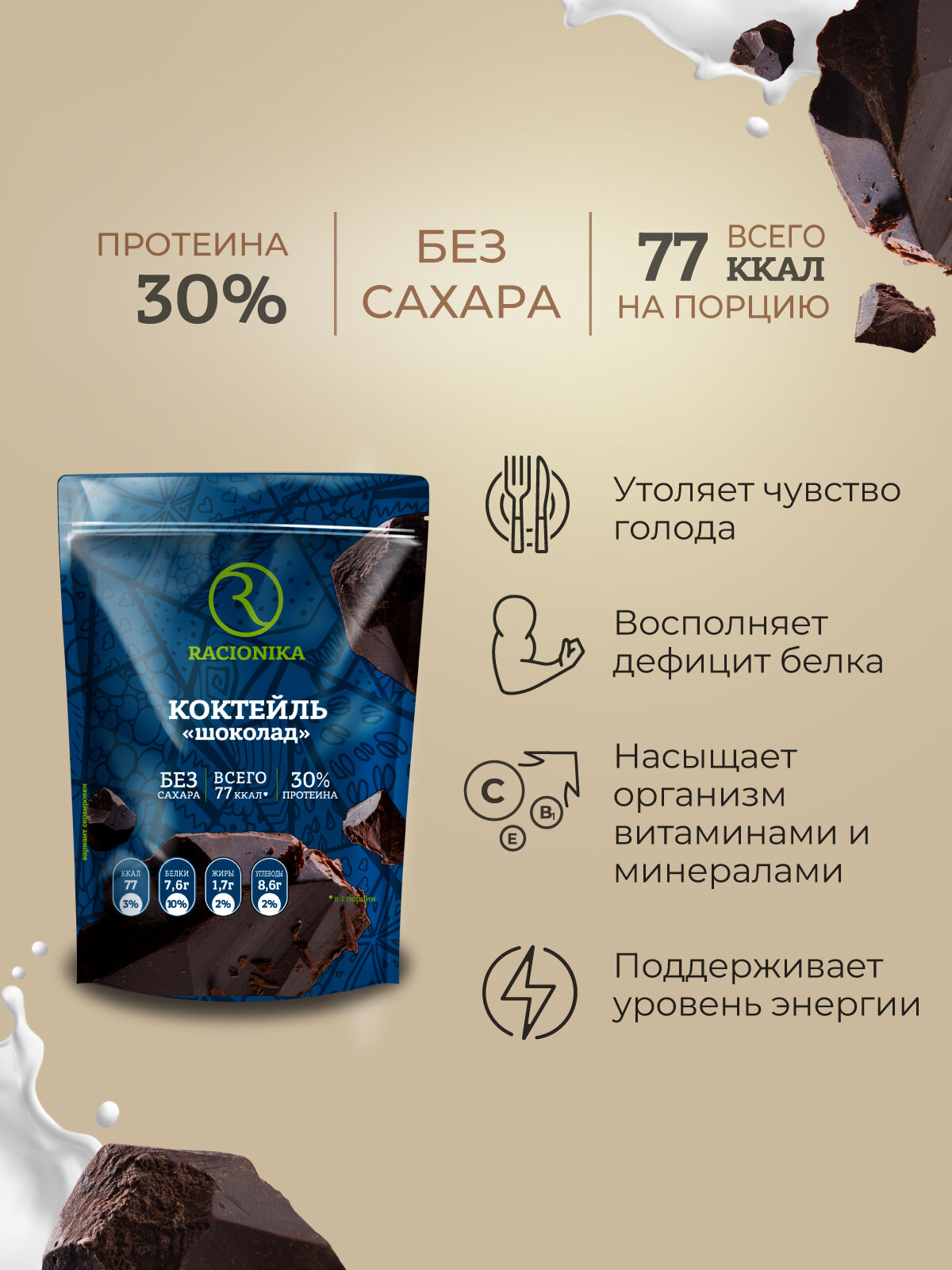 Протеиновый коктейль рационика, коктейль для похудения, без сахара, Шоколад 275г