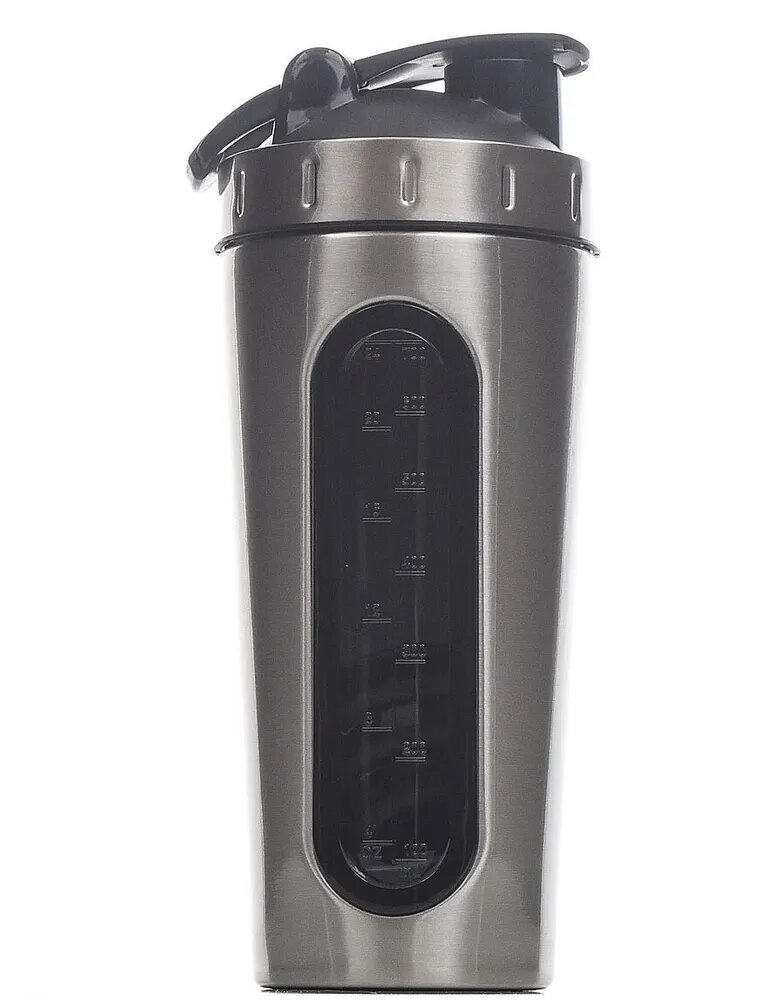 Металлический шейкер для протеина с мерной шкалой и клапаном для защиты от протекания, 700 мл. (Черный)
