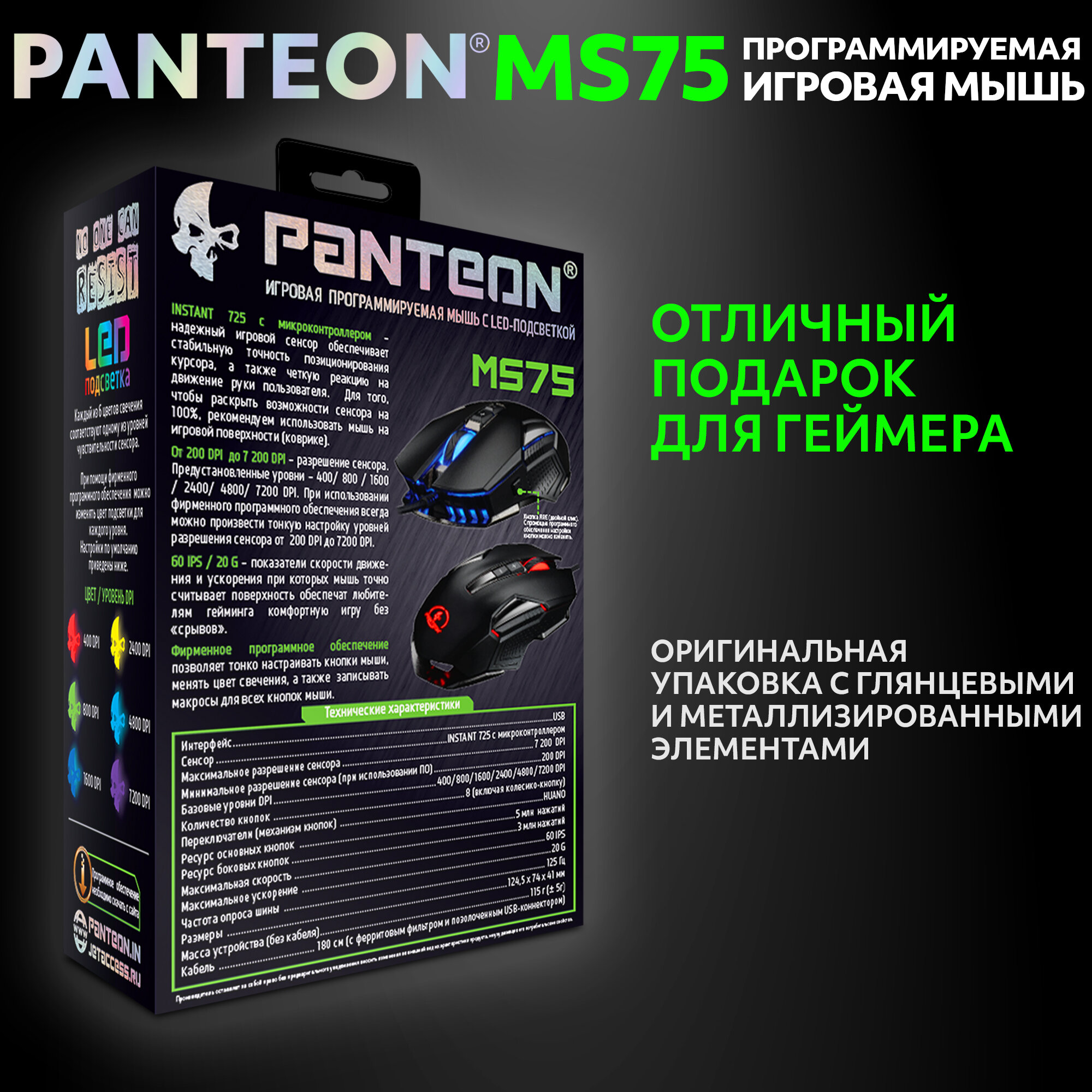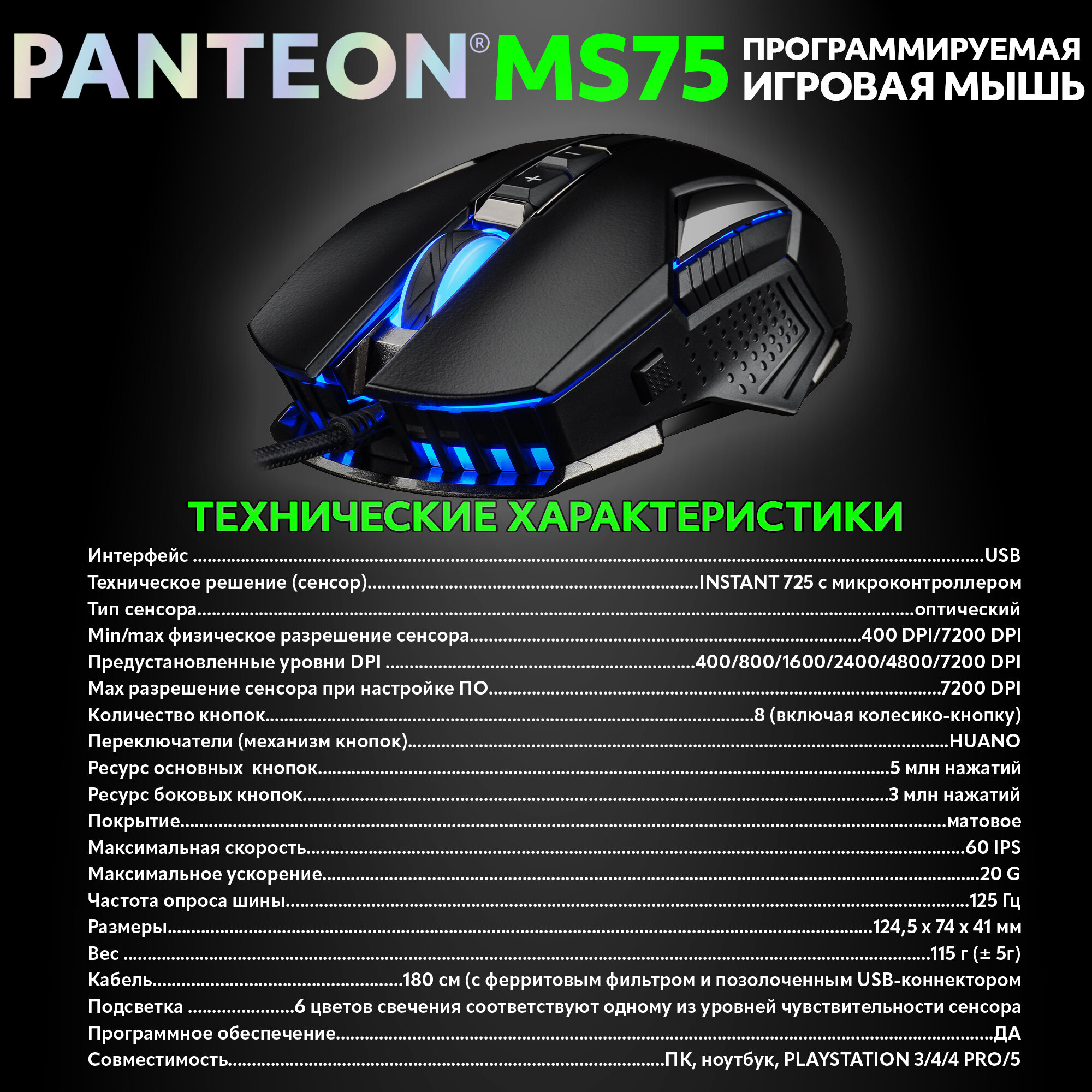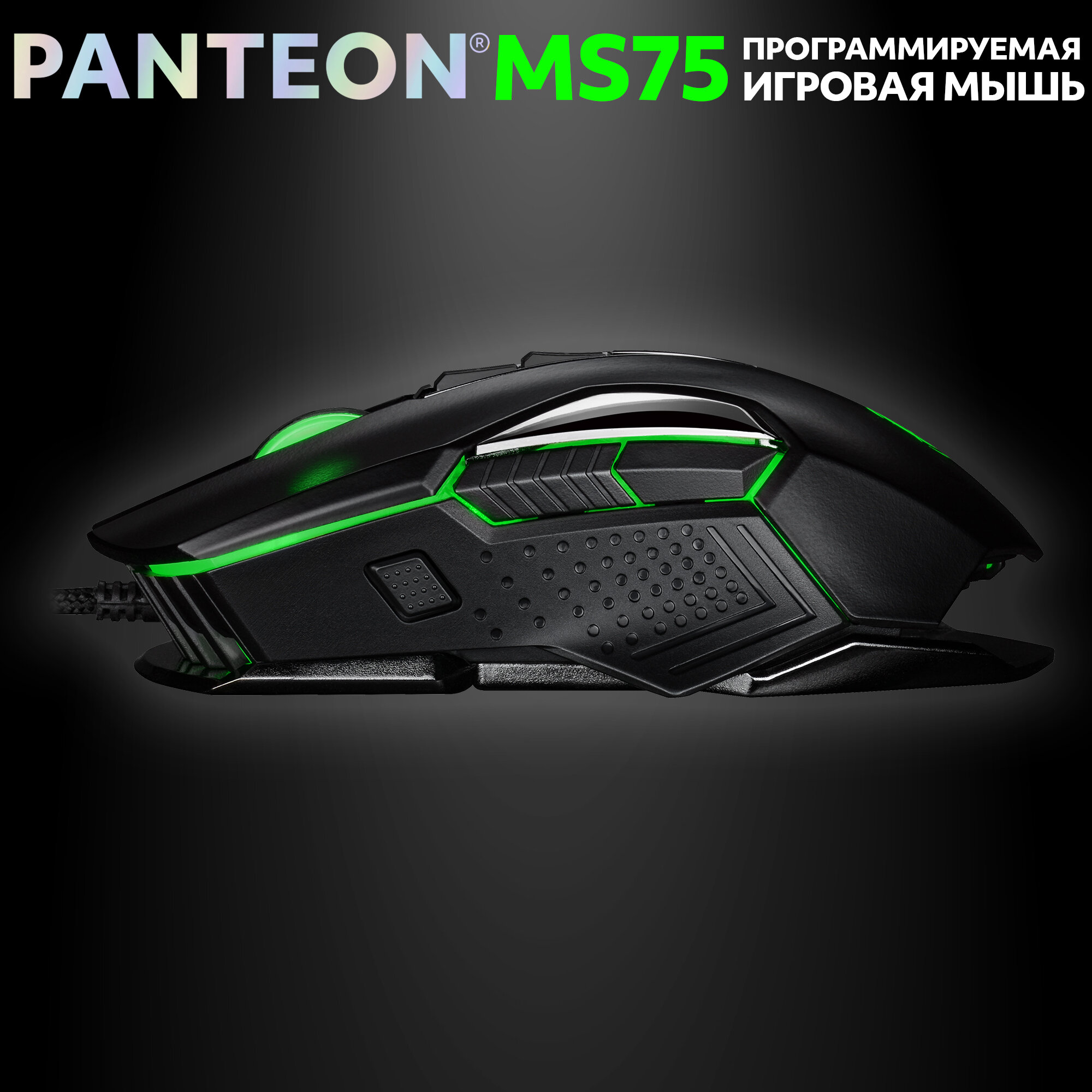 Игровая мышь проводная - программируемая с LED PANTEON MS75 черная (INSTANT 725, 60 IPS/20G, кабель 1.8м,USB)