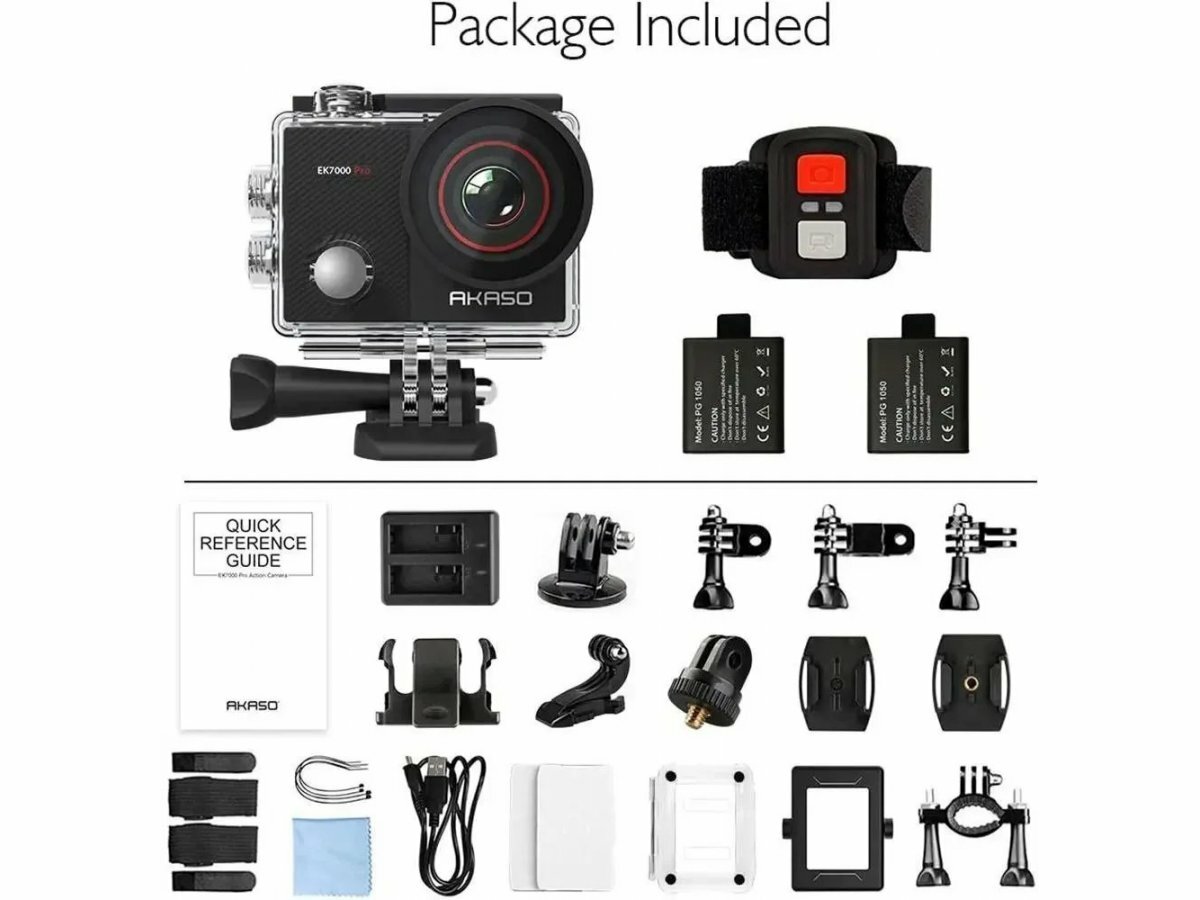 | Комплектация | 1x AKASO EK7000 Pro Action Camera, 1x Пульт управления, 1x ЗУ для аккумуляторов, 2x 1050 мАч аккумуляторы, 1x Влагозащищенный чехол, 1x Крепление для велосипеда, 7x различных креплений, 2x Фиксаторы, 2x Крепления для шлема, 1x Ремешок, 5x Стяжки, 1 x Защитная задняя крышка, 1x microUSB кабель, 1x Тряпочка для протирки линзы, 1x Quick Reference Guide |