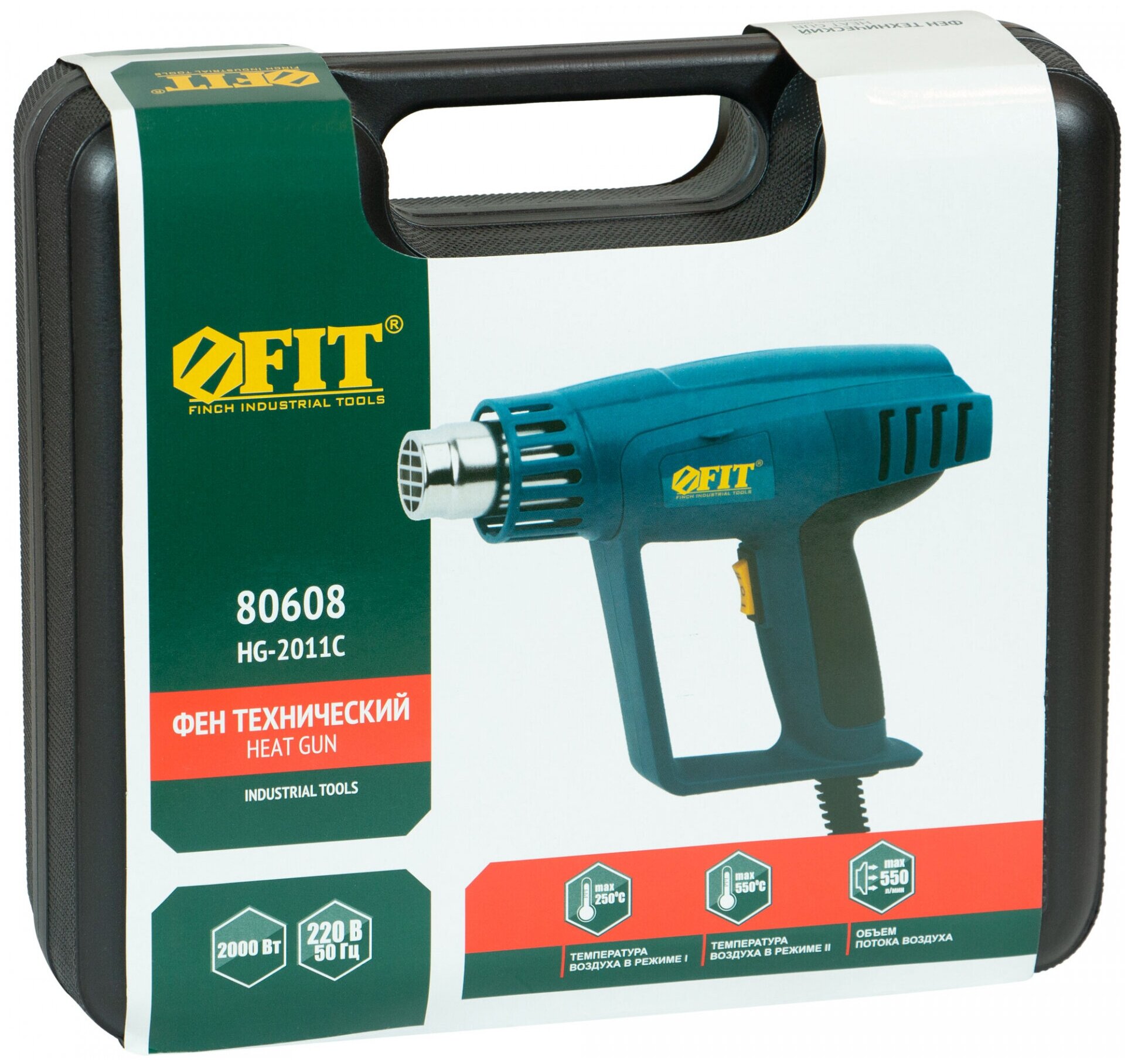 Фен технический 2000 Вт; 250/500 °C; 250/550 л/мин; рез. накл.; кейс, FIT 80608 (1 шт.)