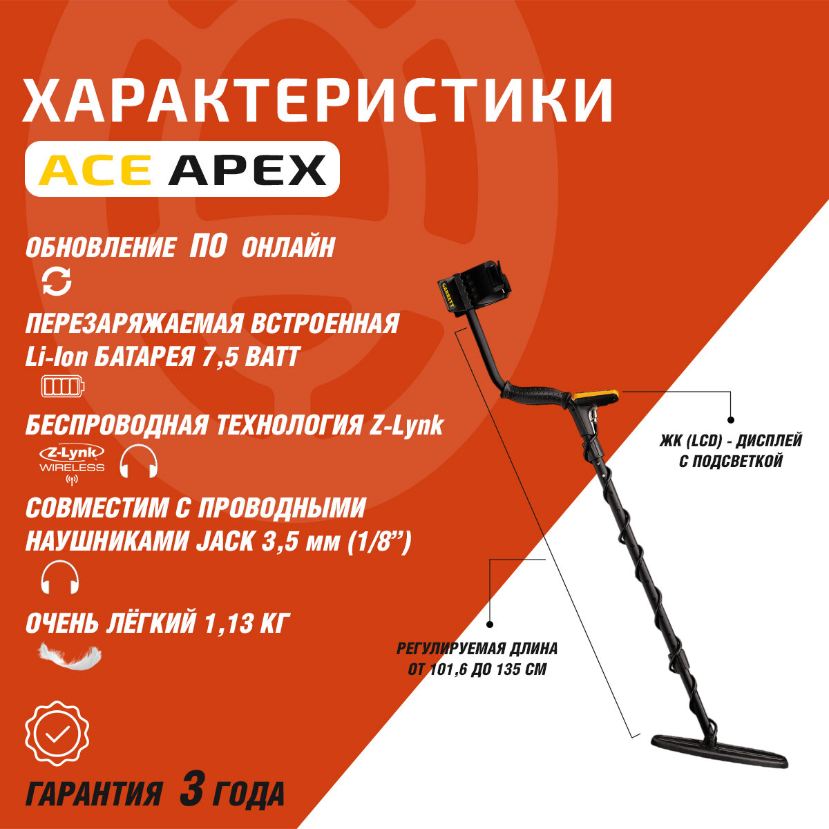 Металлоискатель Garrett ACE Apex + наушники MS-3 Z-Lynk (катушка 8,5х11) грунтовый