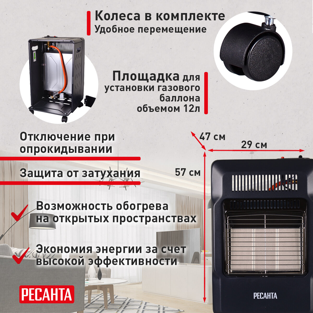 Прост в использовании, быстро нагревает помещение, запах газа отсутствует