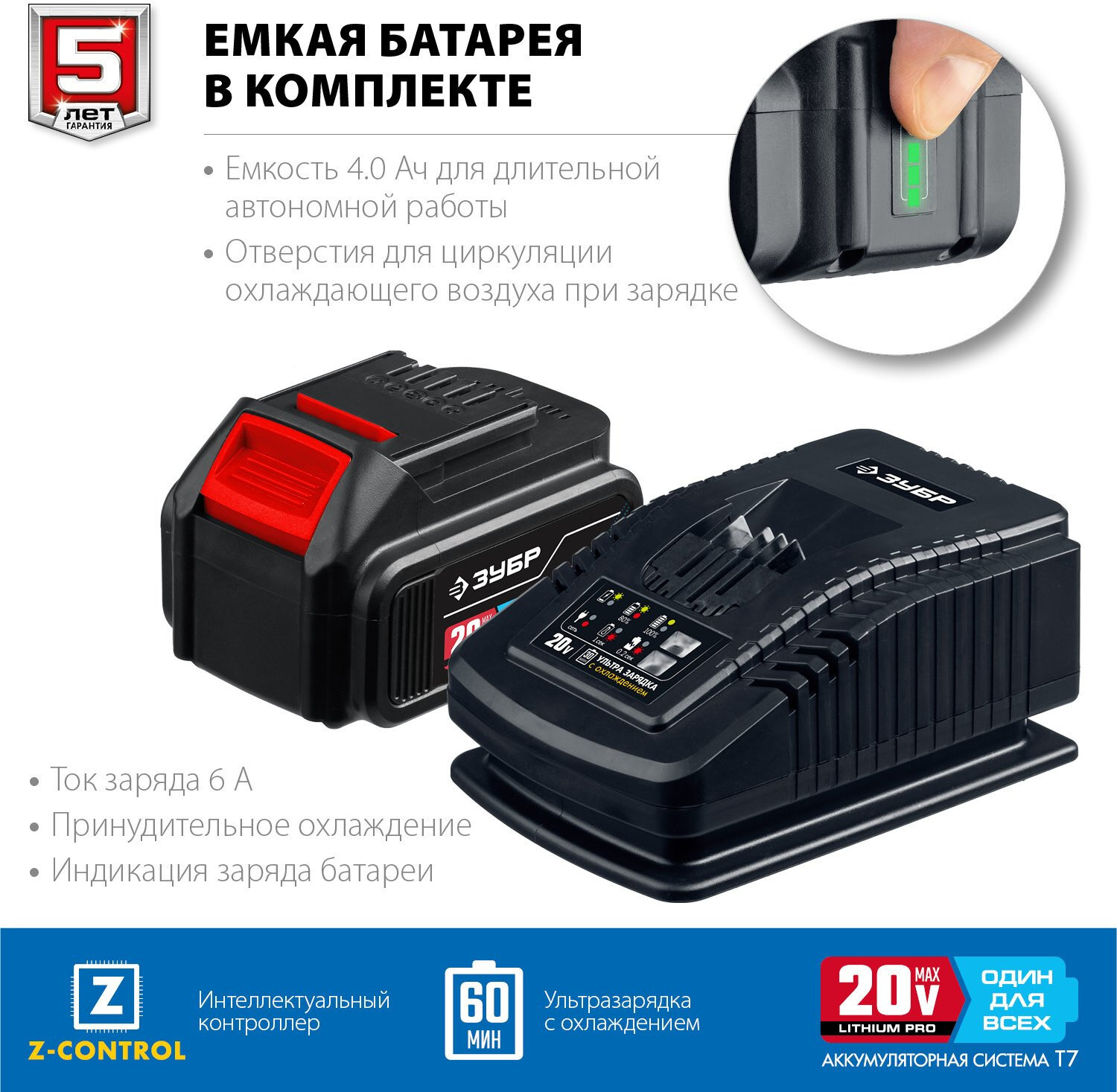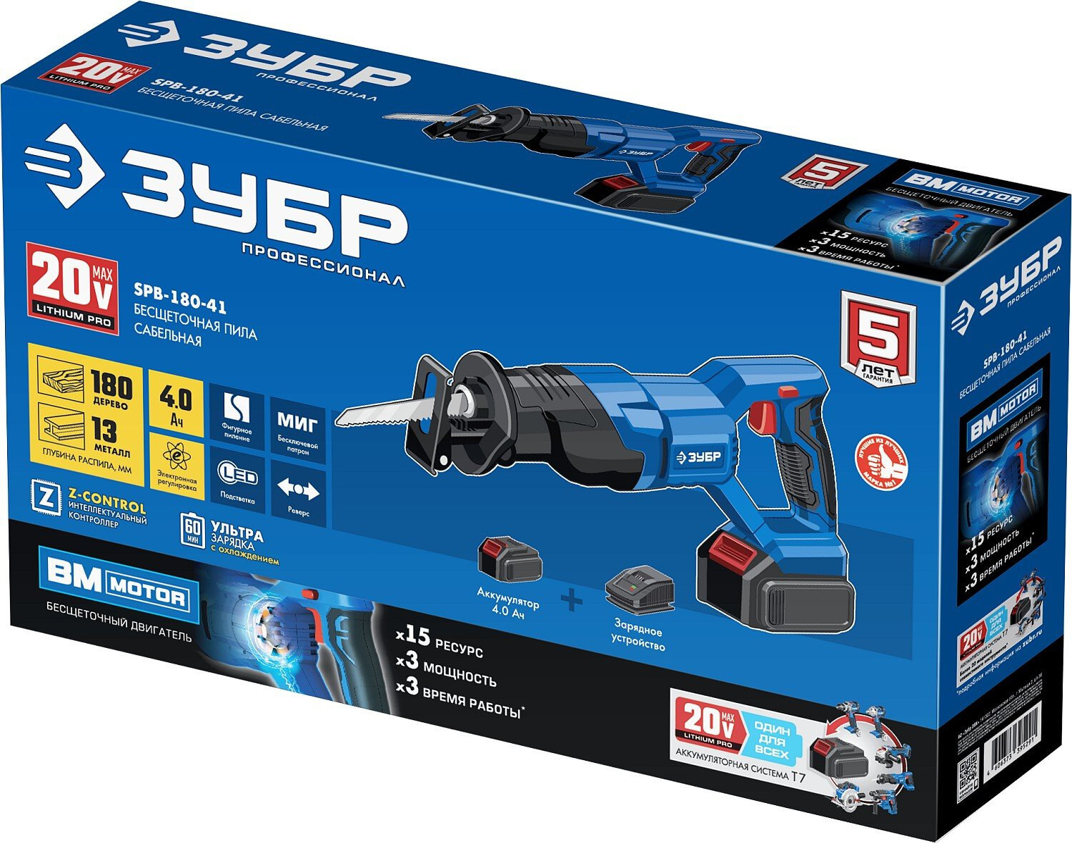 ЗУБР Т7, 20 В, 180 мм, 1 АКБ (4 Ач), бесщеточная пила сабельная, Профессионал (SPB-180-41)