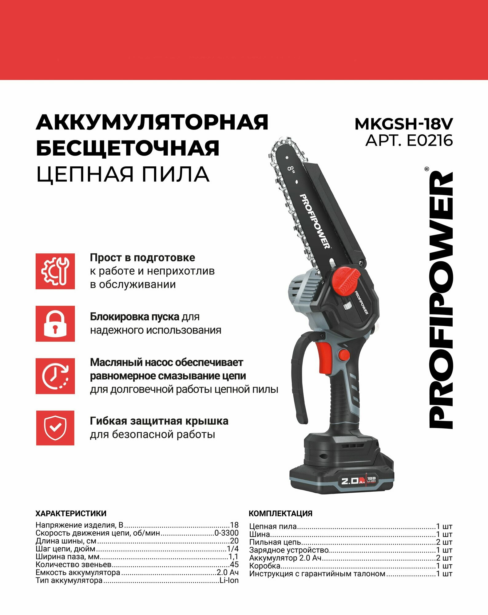 Пила цепная аккумуляторная PROFIPOWER MKDUC-18V E0114 (Li-ion 1шт, 4.0Ач)