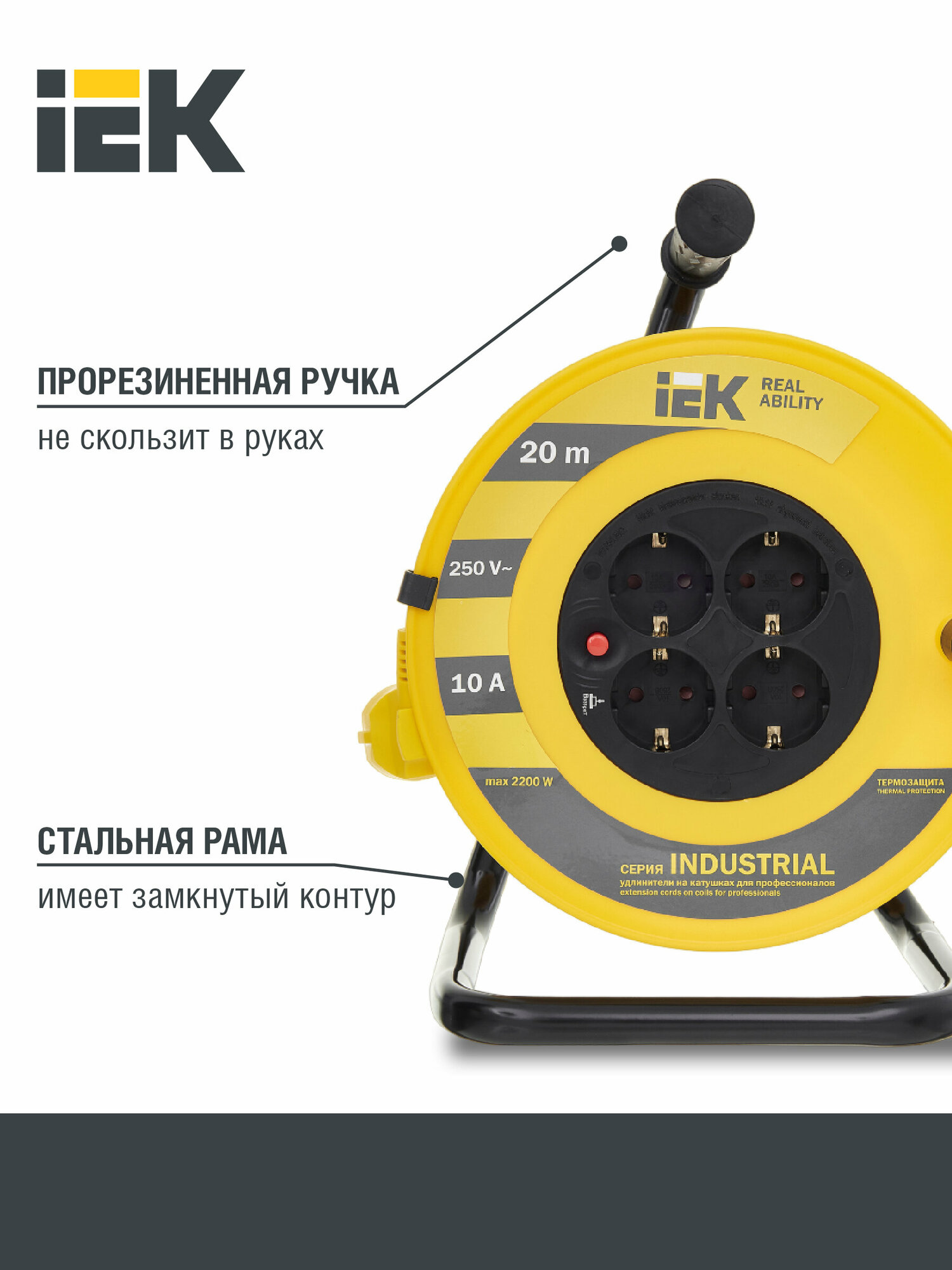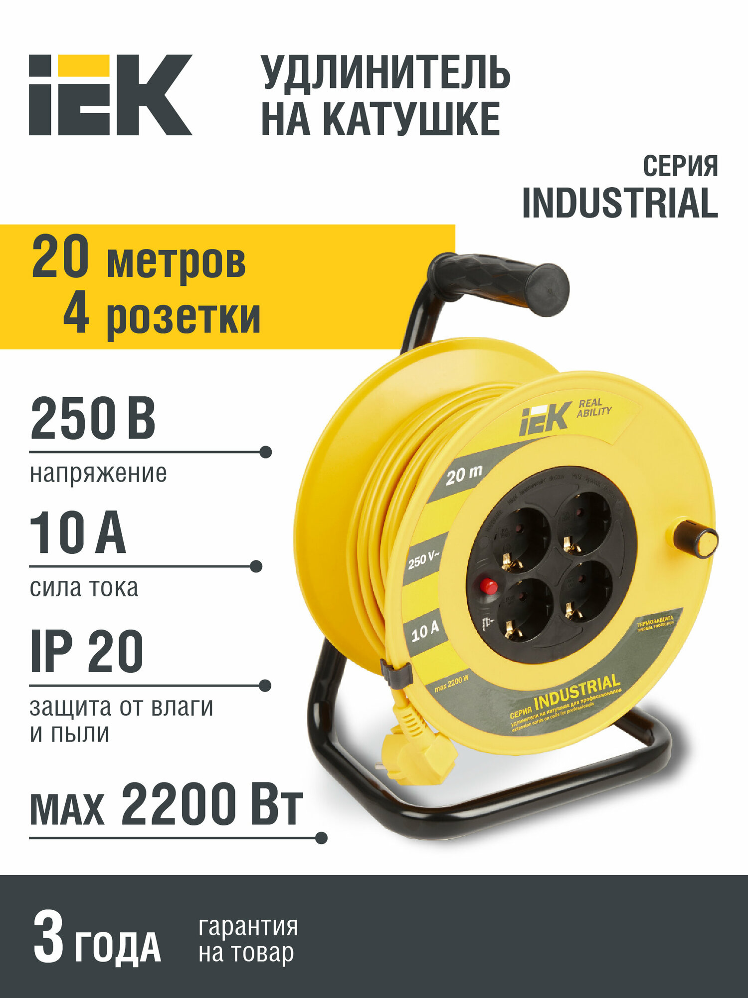 Удлинитель на катушке IEK Industrial УК20, 4 розетки, с т/з, с заземлением, 3 x 1 мм², 20 м