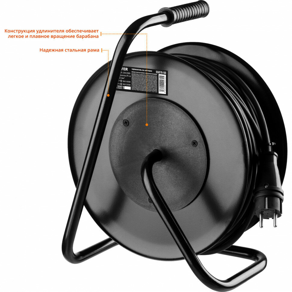 STAYER PRO-325, КГ, 3 х 2.5 мм2, 50 м, 4000 Вт, IP44, силовой удлинитель на стальной катушке (55076-50)