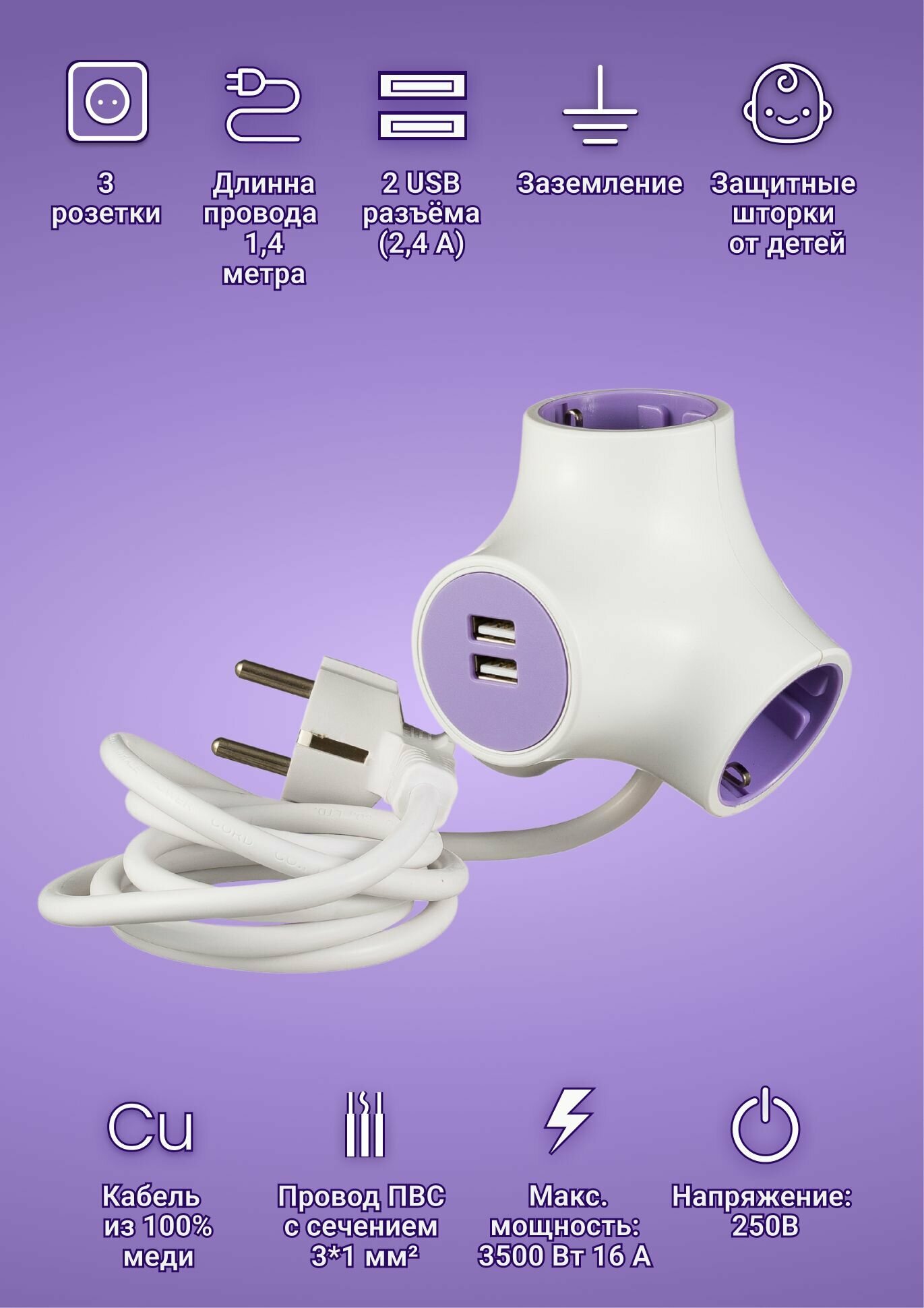 Купить Удлинитель сетевой с USB 1.4м старт тройник с заземлением 16А, 3500Вт