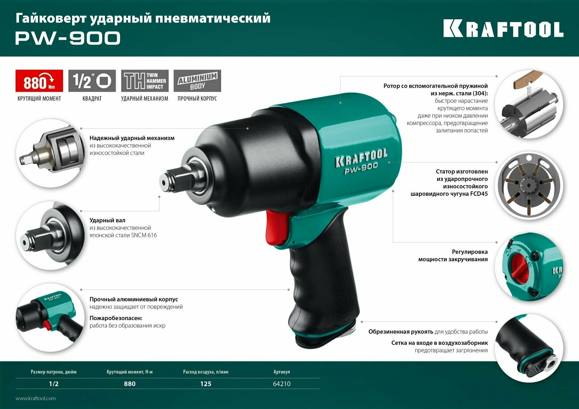 KRAFTOOL PW-900, 1/2, 880 Н·м, Ударный пневматический гайковерт (64210)