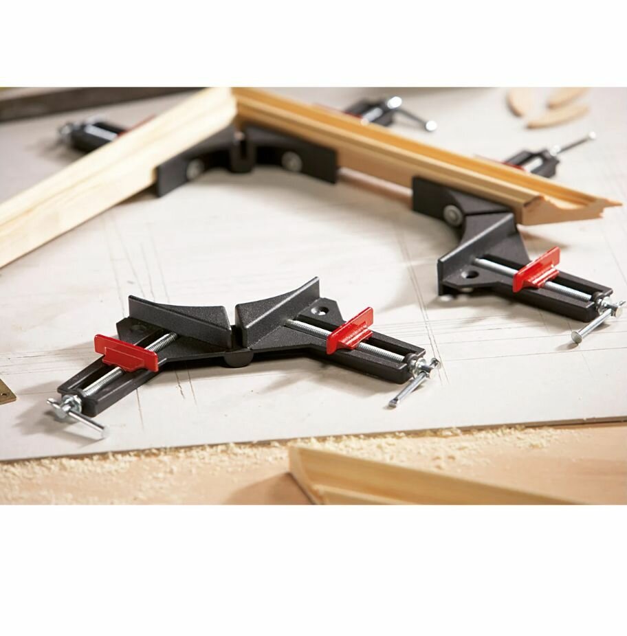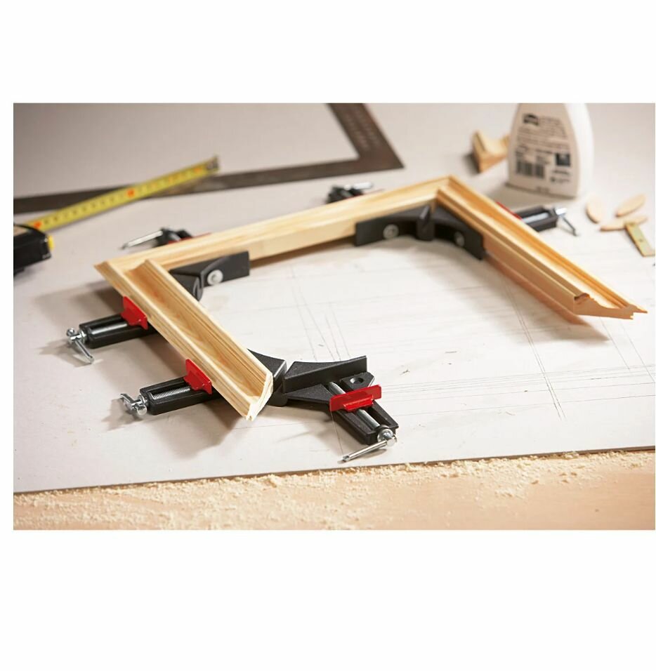 | Плюсы: | качество исполнения. для сборки-склейки рамок, багетов и других прямоугольных изделий незаменимые "освободители" рук. При работе с серией изделий одного размера можно закрепить к рабочей поверхности как шаблон через отверстия в корпусе. Добавил силиконовые накладки на губки зажимов и в работу. Фиксация деталей надежная, прецизионно точная. |