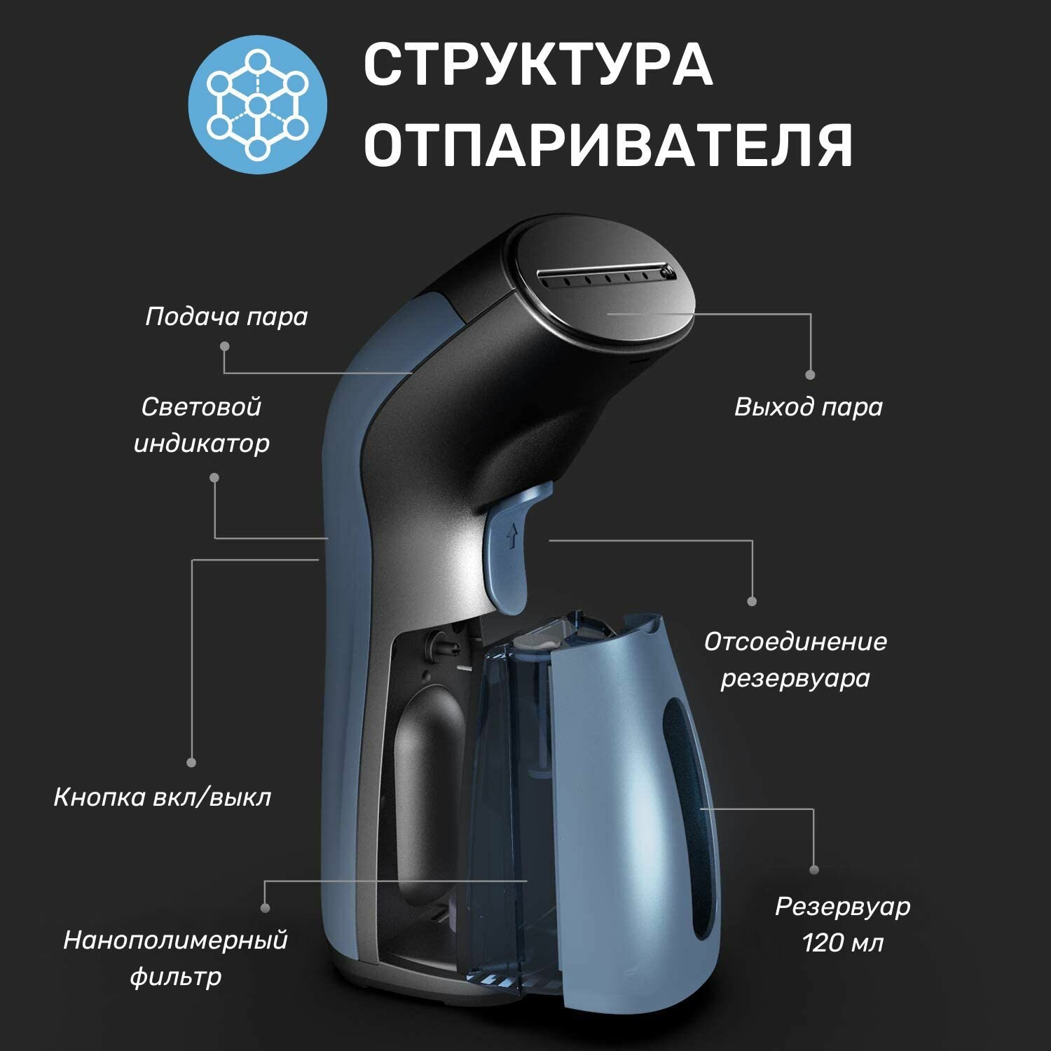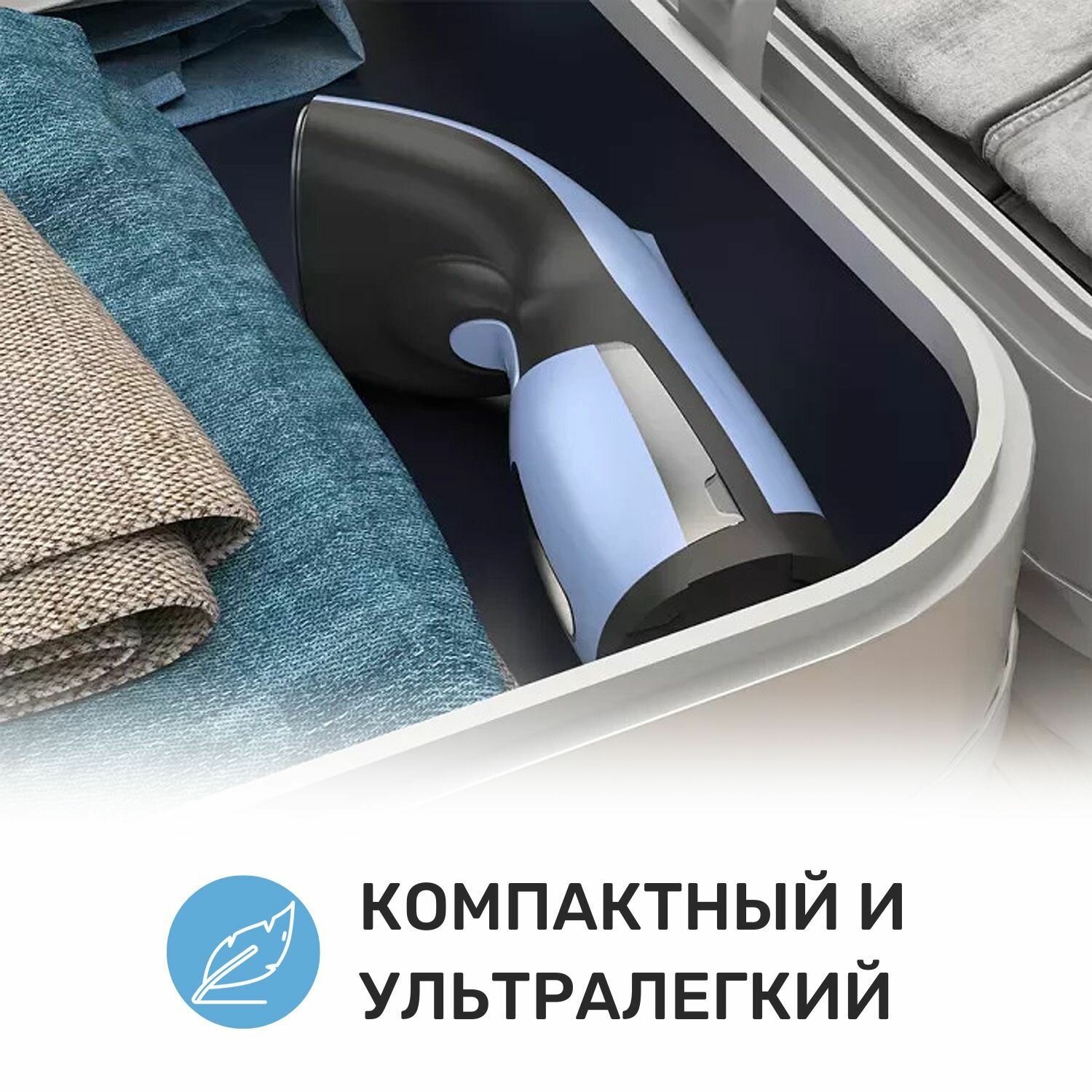 Компактный, удобно брать в поездки, есть чехол, мерный стаканчик, отпаривает хорошо, можно держать под любым углом, нагревается быстро.