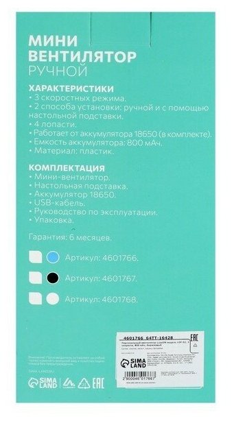 Портативный ручной вентилятор Luazon LOF-02, 3 скорости, на аккумуляторе, 800 мАч, бирюзовый интересное: