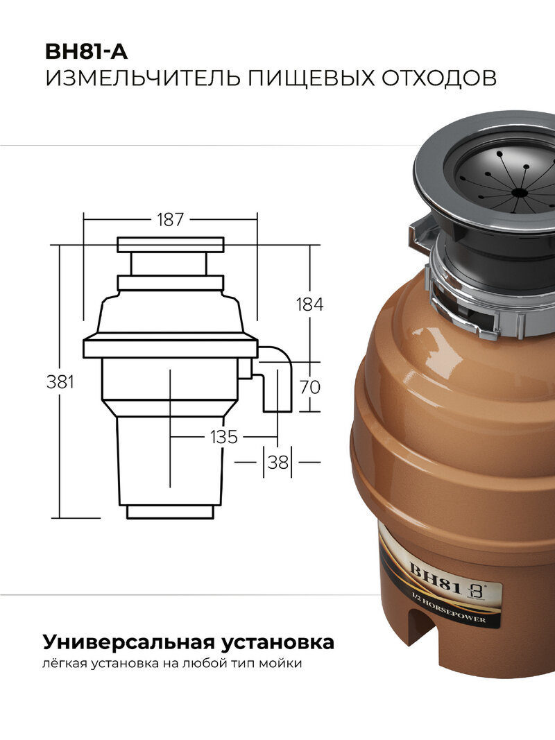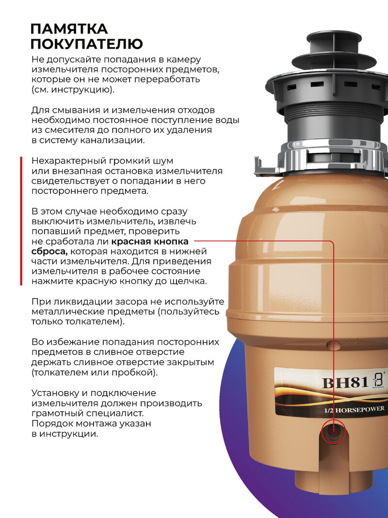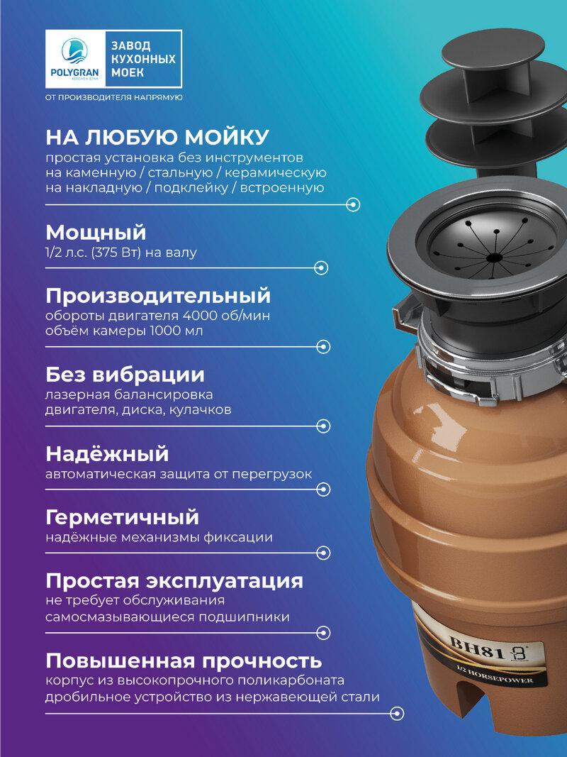 Измельчитель бытовых отходов для кухонной мойки Bone Hammer BH81 интересное: