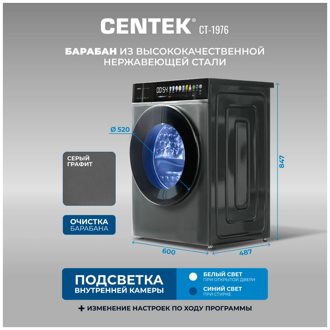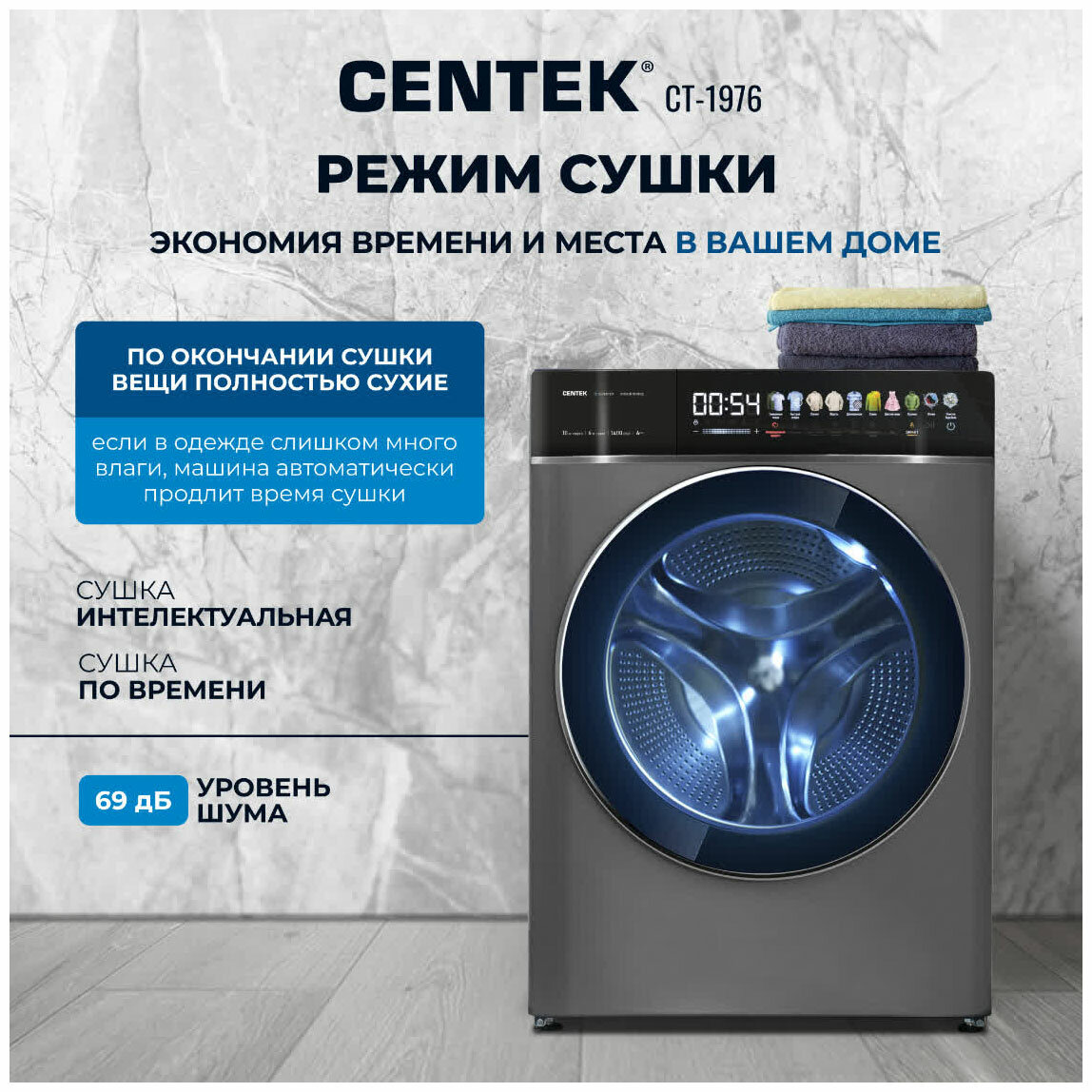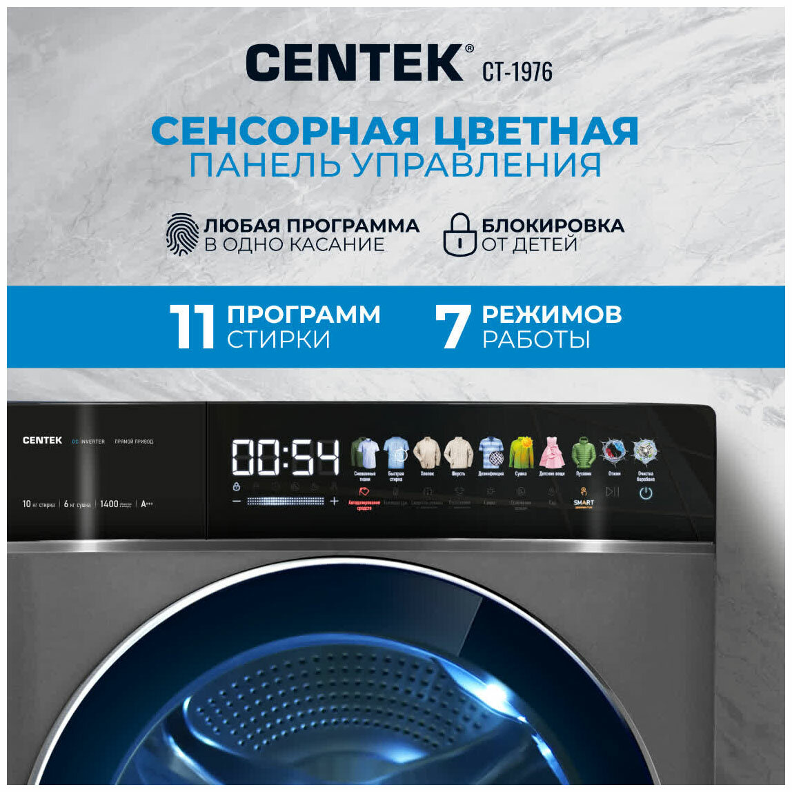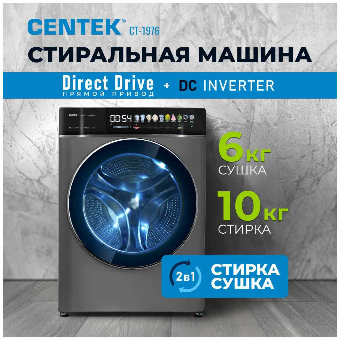 Стиральная машина Centek CT-1976 (с сушкой) прямой привод, сенсорное управление, инверторный двигатель, подсветка барабана, обработка озоном, загрузка 10 кг