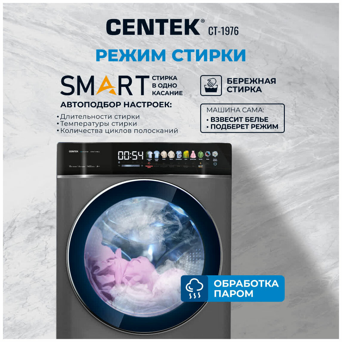 Стиральная машина с сушкой, инвертором и паром Centek CT-1976 /автомат//Серый графит/10кг/6кг/11пр/Прямой привод/Узкая/Озонирование/Цветной сенсор/A+++/3 года гарантии