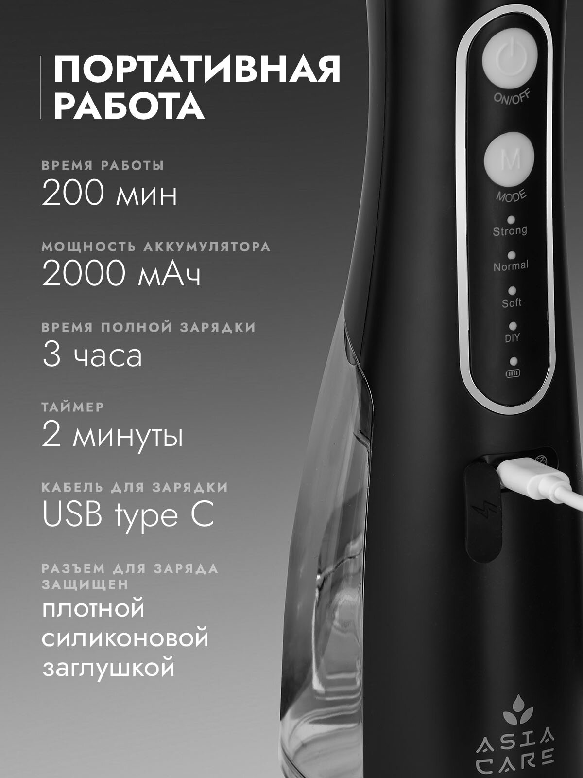 Ирригатор для полости рта портативный AsiaCare PRO+, 14 насадок, прибор для чистки брекетов, языка, коронок, имплантов, черный