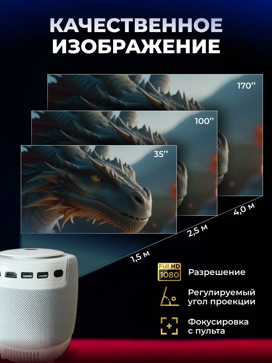 Проектор Q4 PRO Full HD 1080p Android TV Smart Wi-Fi 5G, Портативный для игр и кино с HDMI, Белый