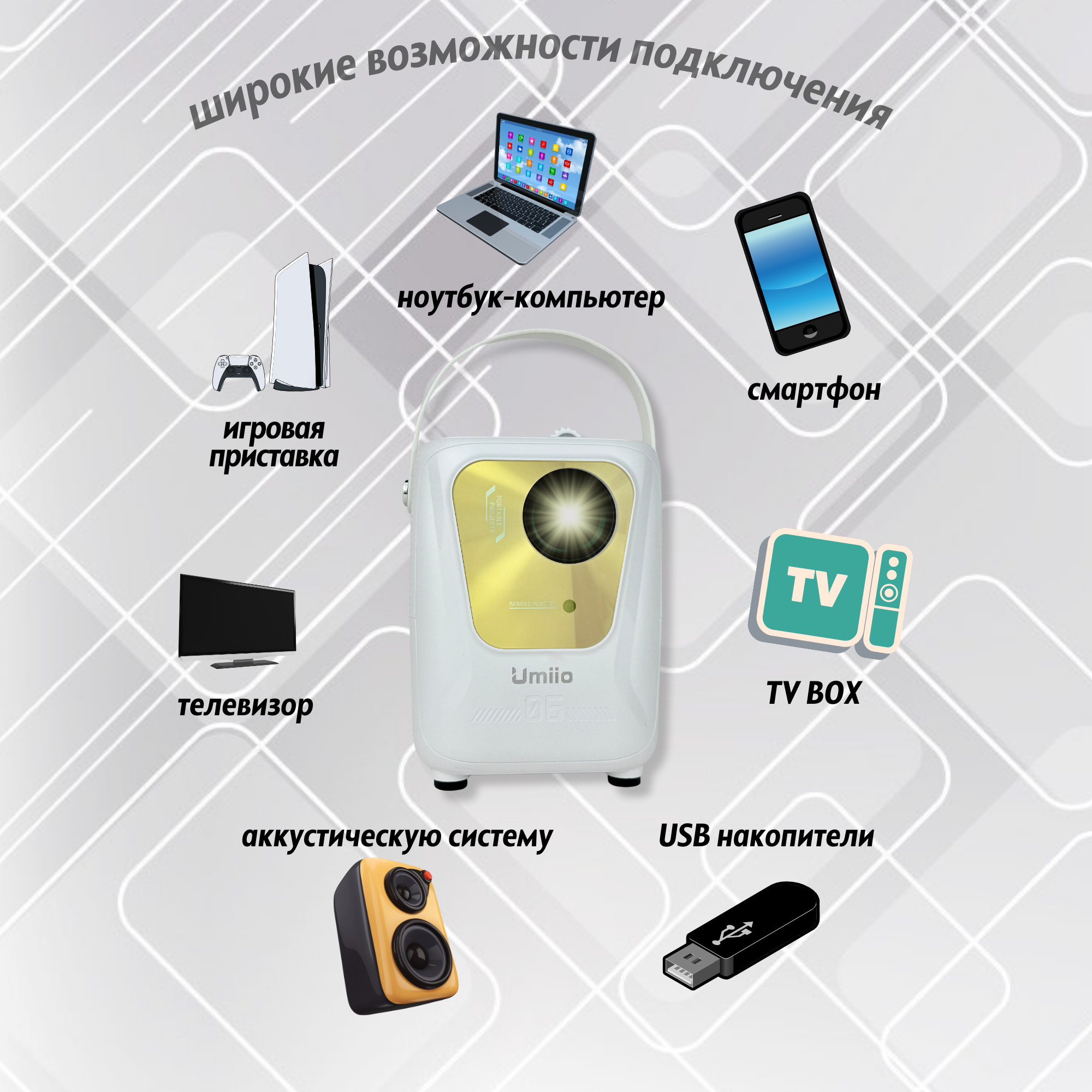 Портативный проектор, для домашнего кинотеатра, Bluetooth, WI-Fi, Full HD с русским языком, Umiio Q1, белый