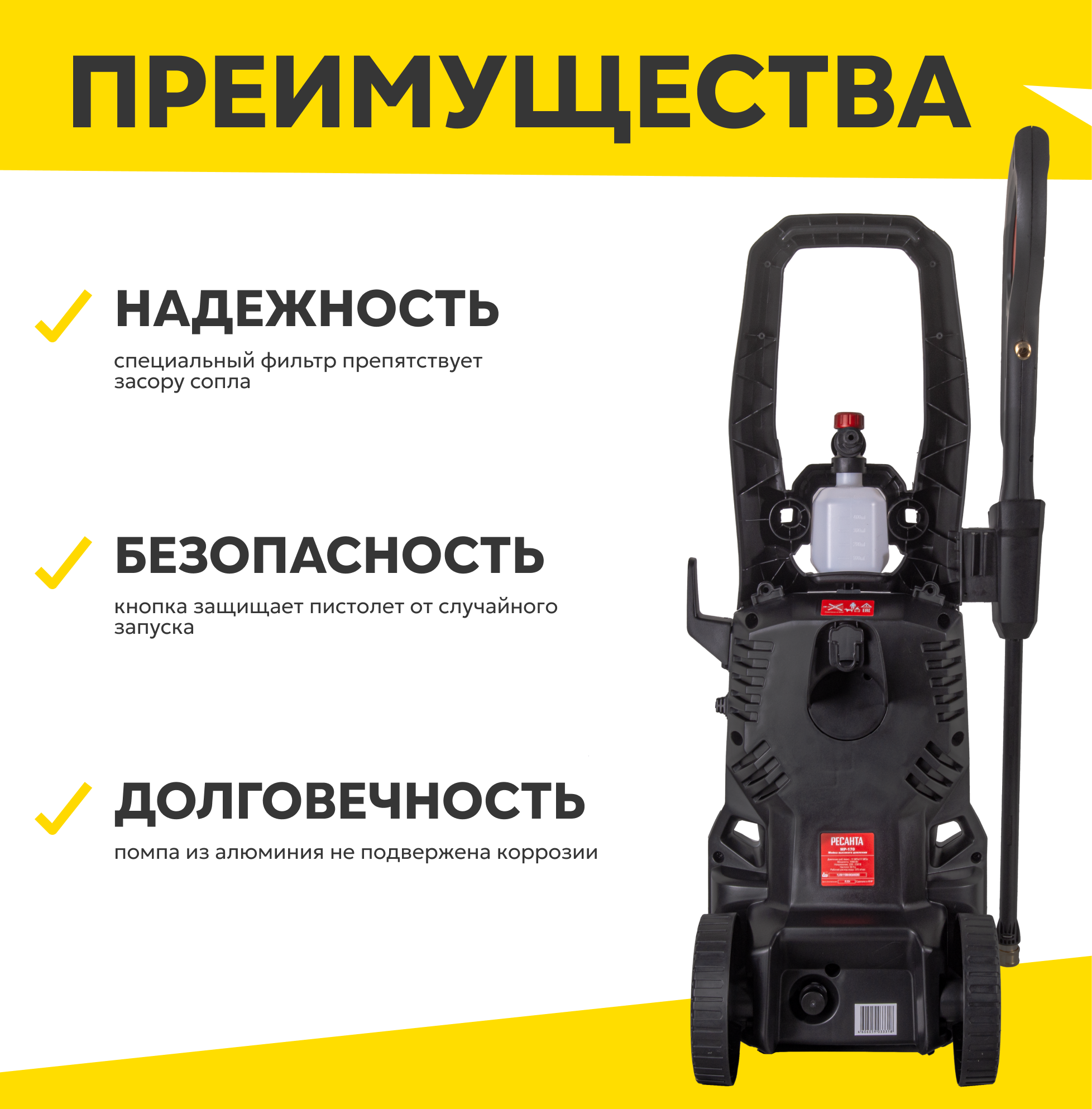 Мойка высокого давления РЕСАНТА МР-170, 1900 Вт, 170 Бар, 375 л/ч, шланг – 8 м, подача воды: водопровод/емкость интересное: