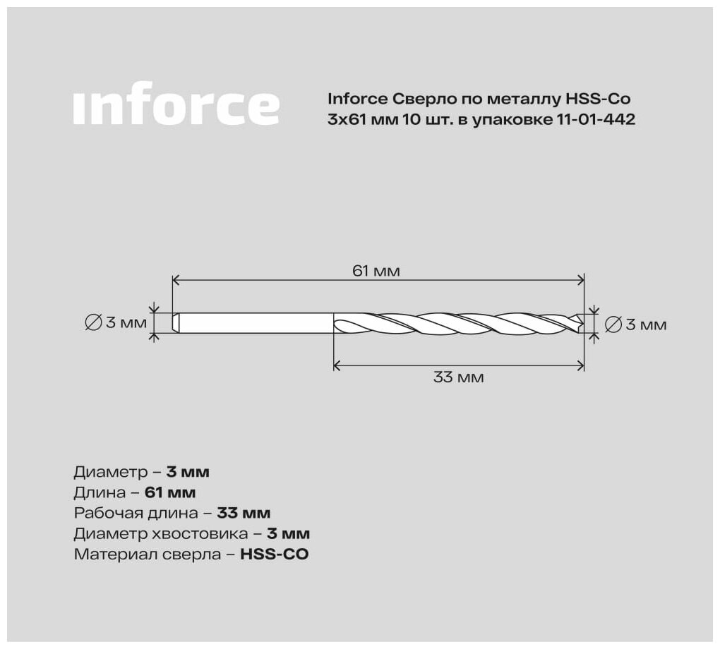 Сверло по металлу HSS-CO (10 шт/уп: 3x61x33 мм) Inforce 11-01-442 15955420 интересное: