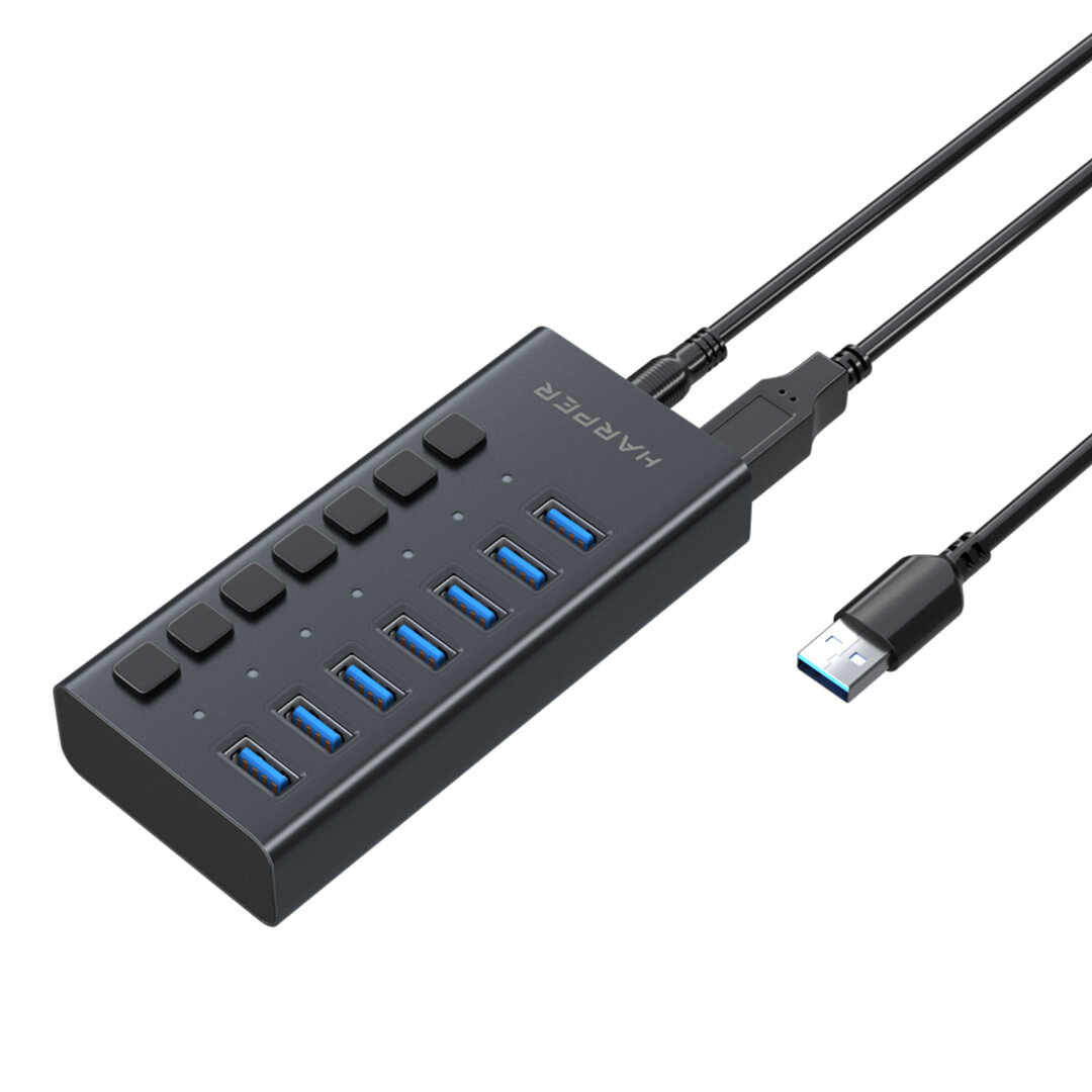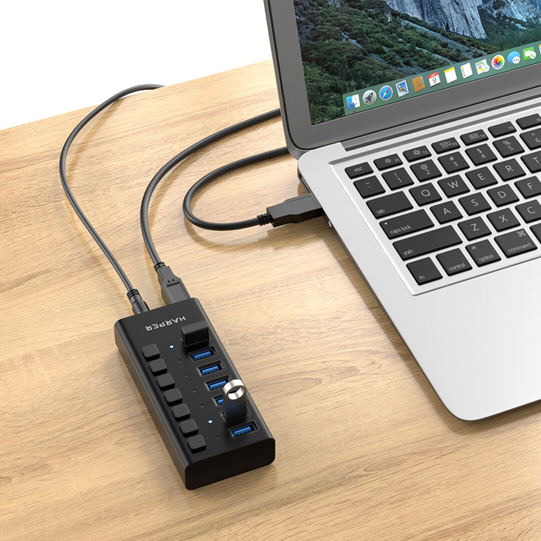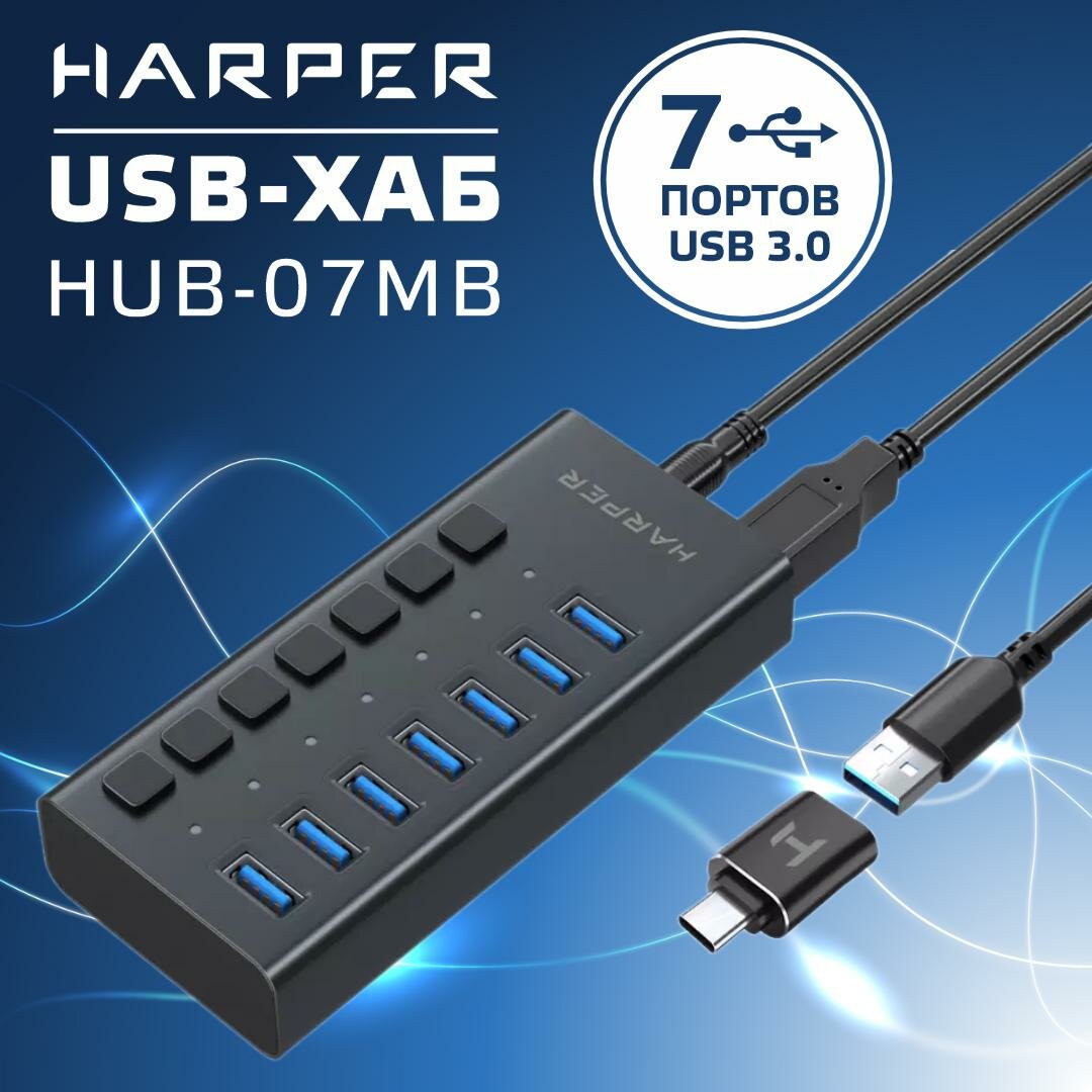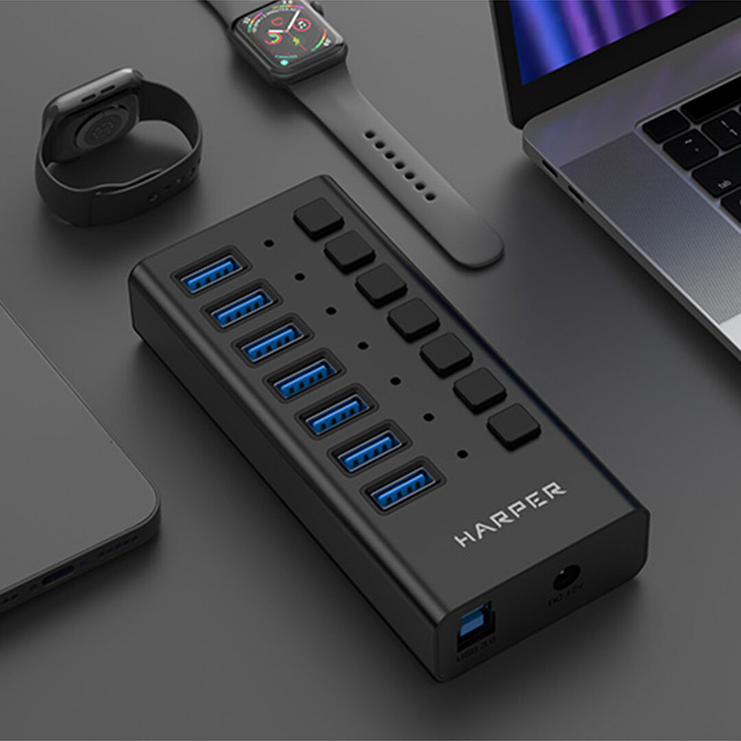 Купить USB Концентратор HARPER HUB-07MB / 7 портов USB 3.0 / скорость передачи данных до 5 Гб / c, черный