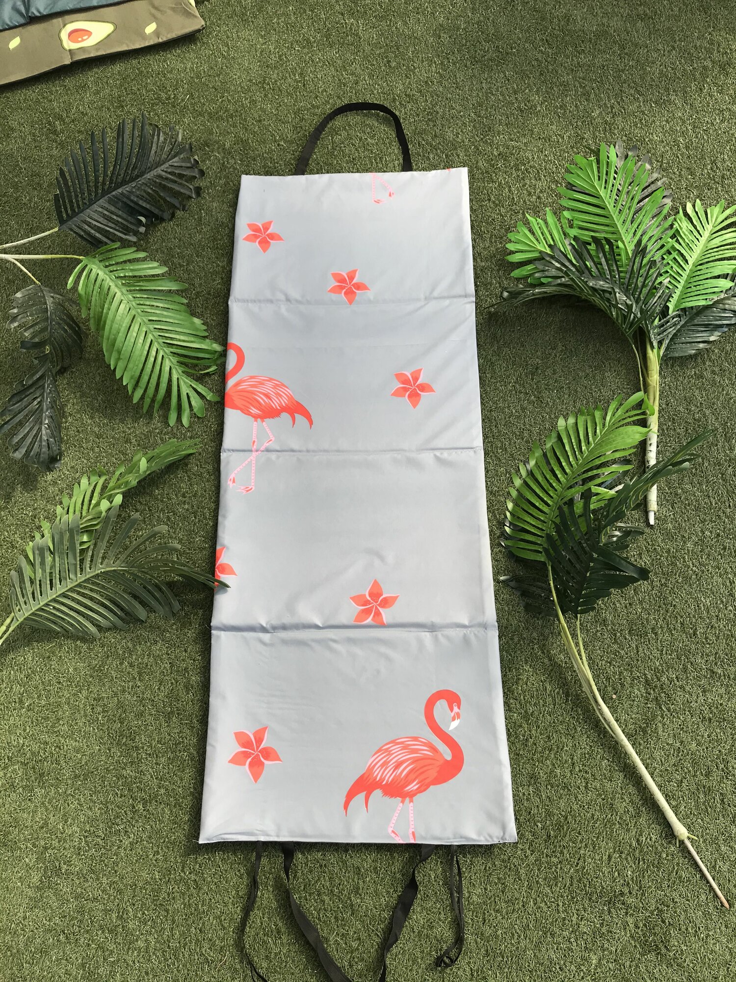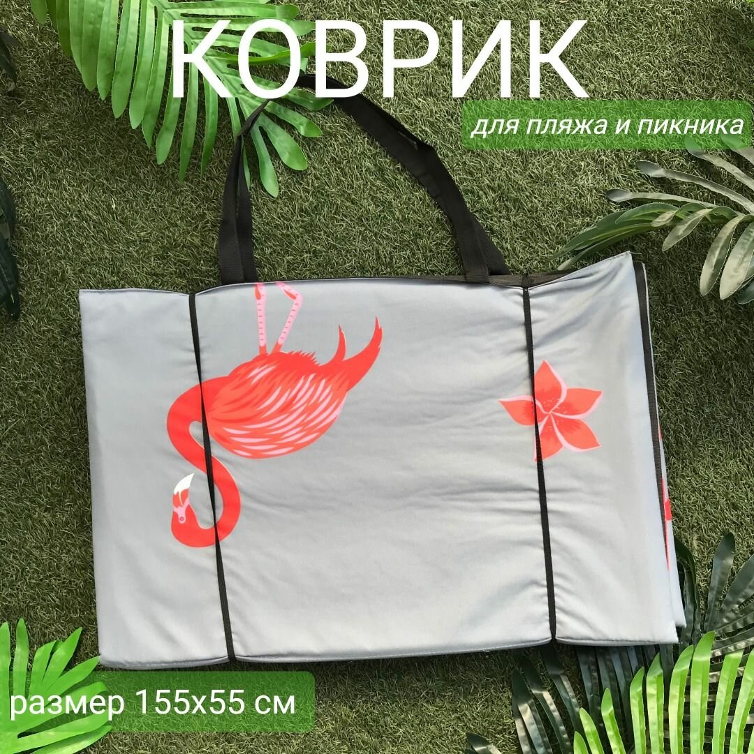 Коврик 155x55x1,0 см, 4 сложения, на резинке,с ручками,наполнитель пенка,Фламинго на сером,арт. 1162