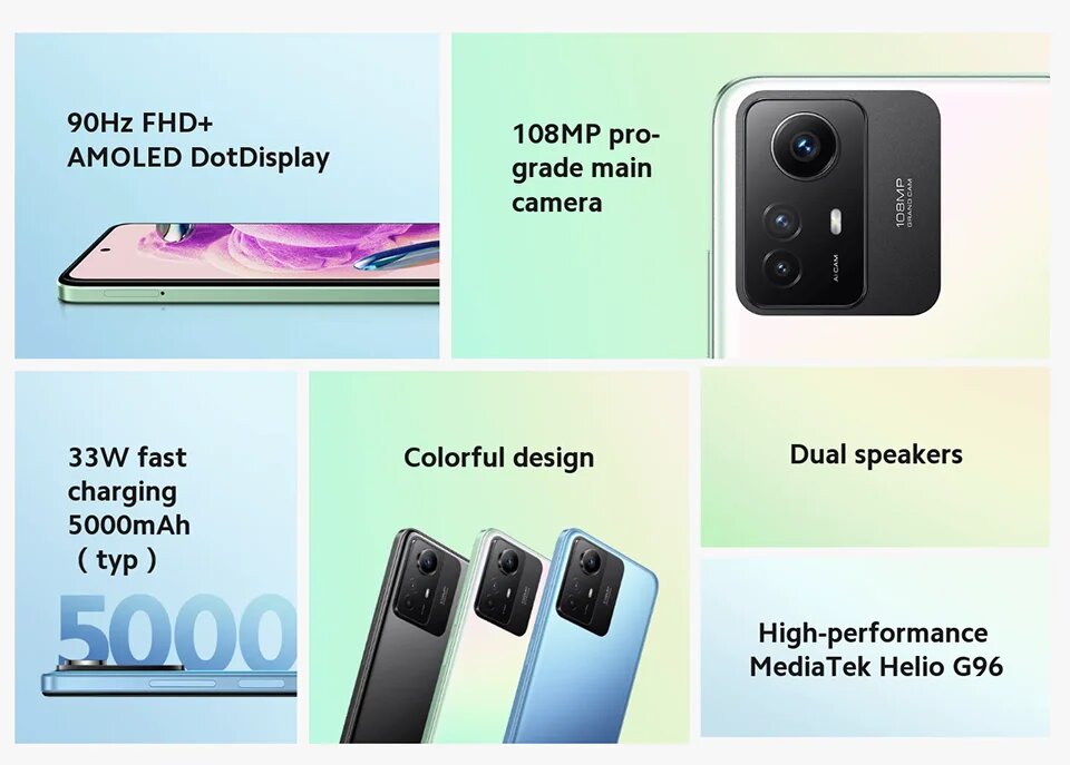 Семейный Redmi Note 12S, 8 ГБ + 256 ГБ, 5,7-дюймовый AMOLED дисплей, MediaTek Helio G96, камера 6,43 Мп + 16 Мп, аккумулятор 5000 мАч (новинка)