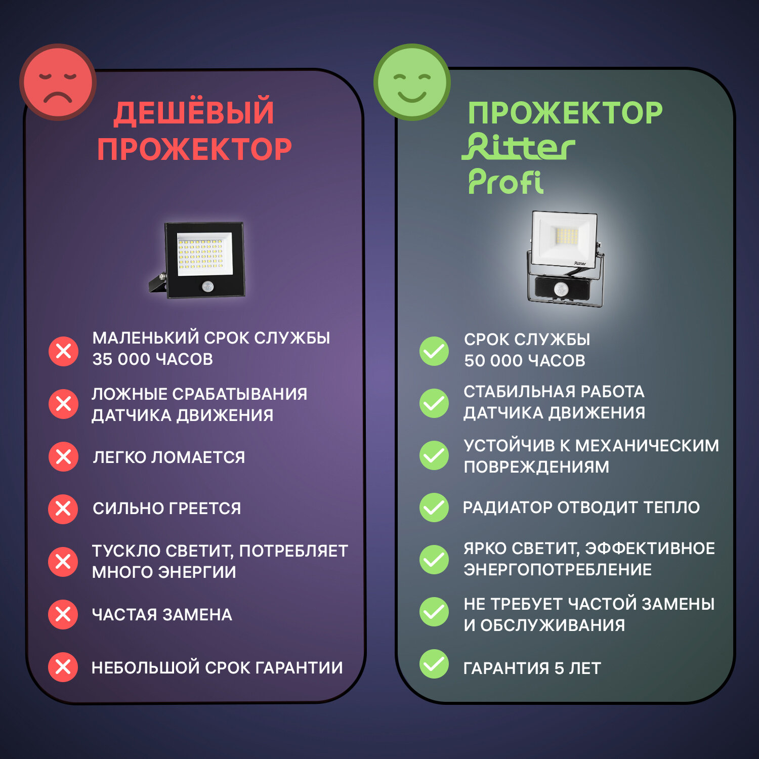 СохранитьRitter Прожектор светодиодный 50Вт уличный, с датчиком движения, холодный свет 6500К, IP65, серия PROFI 53422 2 интересное: