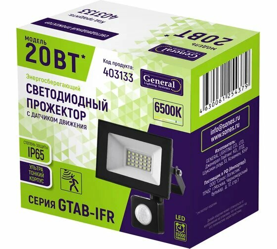 Прожектор светодиодный GTAВ- 20-IP65-6500-IFR 20Вт General с ИК датчиком движения