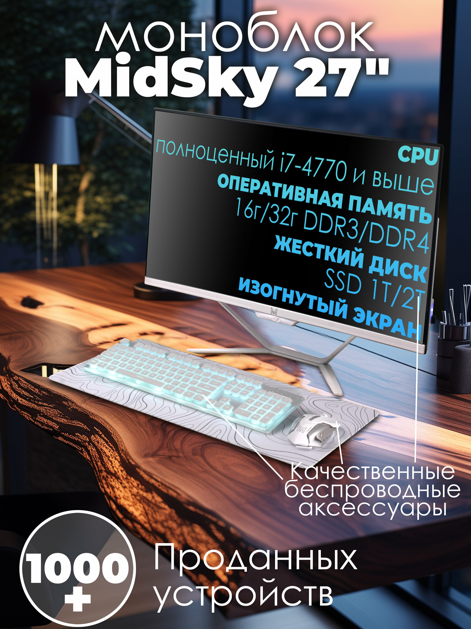 Моноблок OF34473 27" (Intel Core i7-4770S (3.1 ГГц), RAM 16 ГБ, SSD 1 TB, Intel HD Graphics, Windows 10 Pro), белый, крутые аксессуары