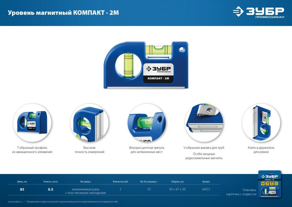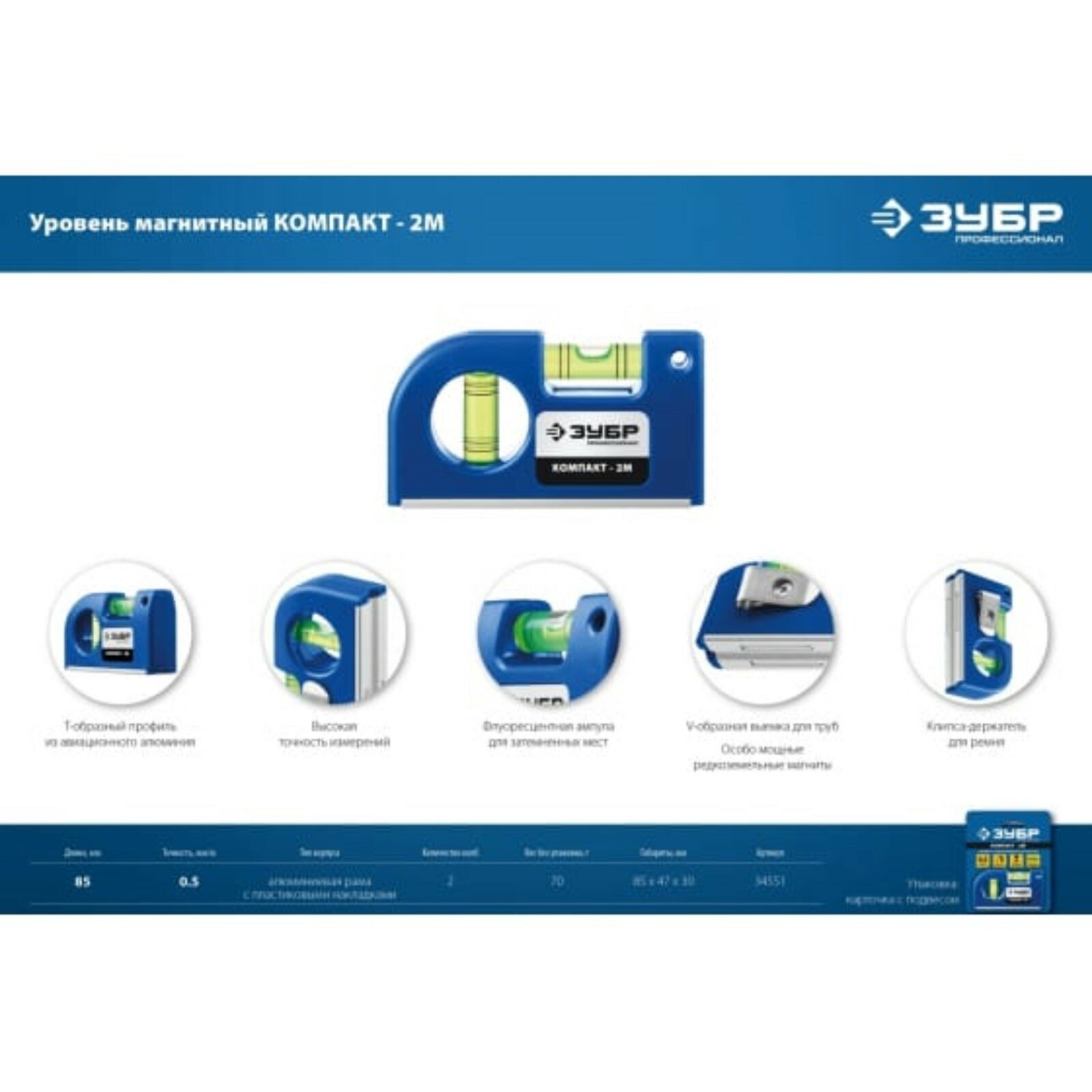 ЗУБР компакт - 2М, 85 мм, магнитный компактный уровень, Профессионал (34551)