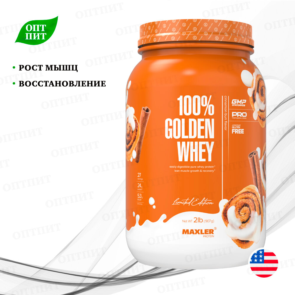 Чистый сывороточный белок премиум класса 100% Golden Whey Protein 908 гр 2 lb (Maxler) Булочка с корицей