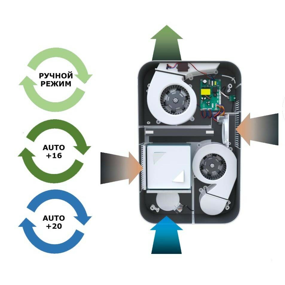 | Плюсы: | раздельный приток и вытяжка. датчик со2, возможность вертикального и горизонтального монтажа |