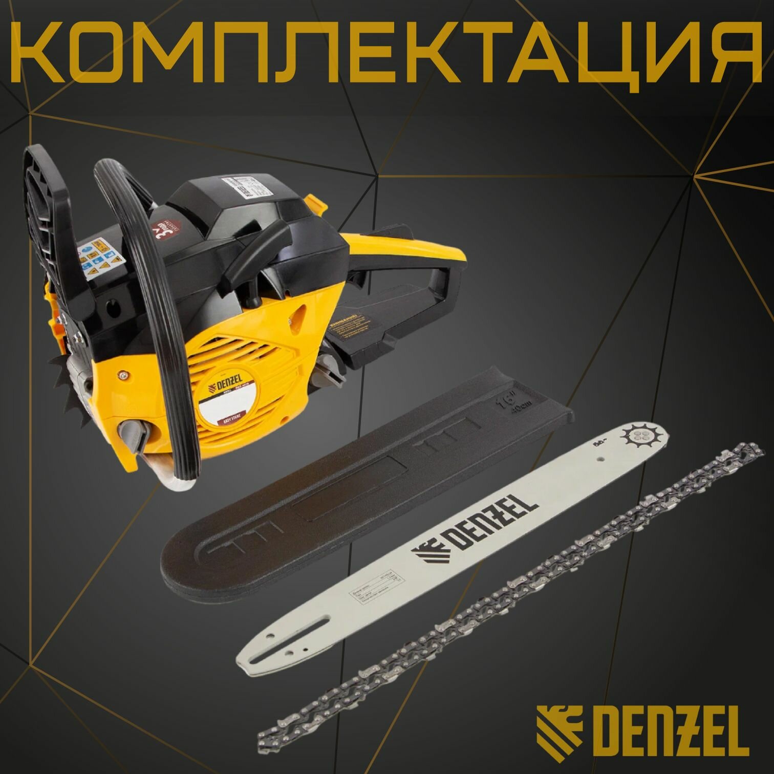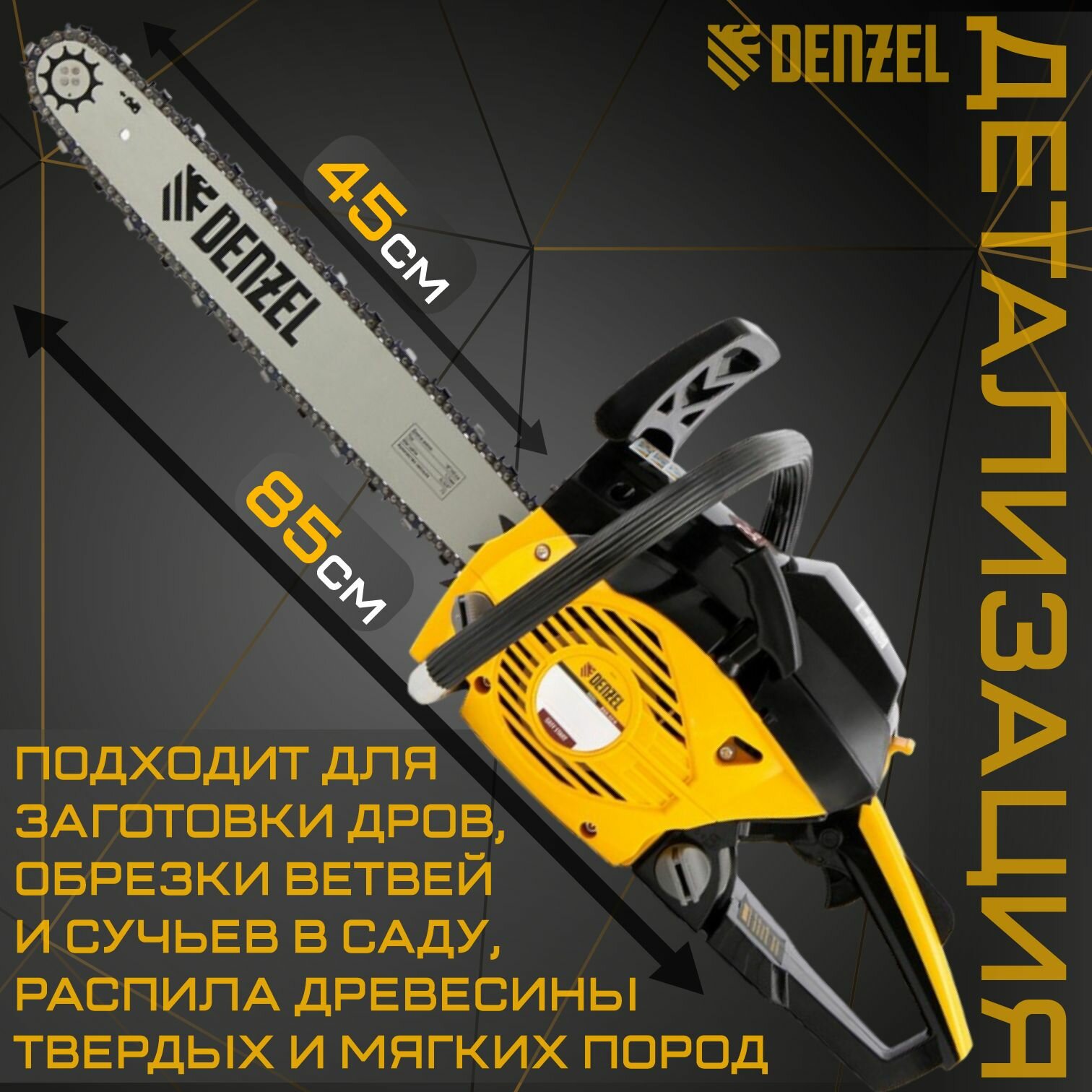 Пила цепная бензиновая DS-4516, шина 40 см, 45 см3, 2,5 л. с, шаг 0,325, паз 1,5 мм, 64 звена Denzel