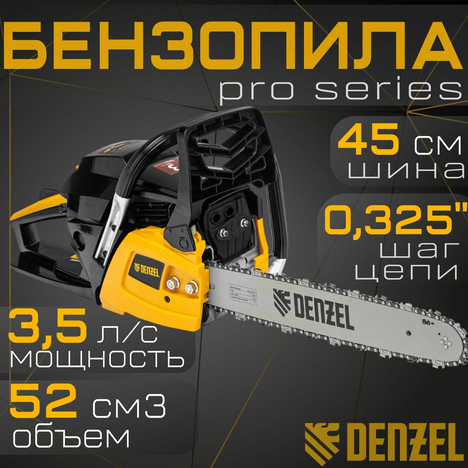 Купить Пила цепная бензиновая DENZEL DS-5218, шина 45 см, 52 см3, 3 л. с, шаг 0,325, 72 звена