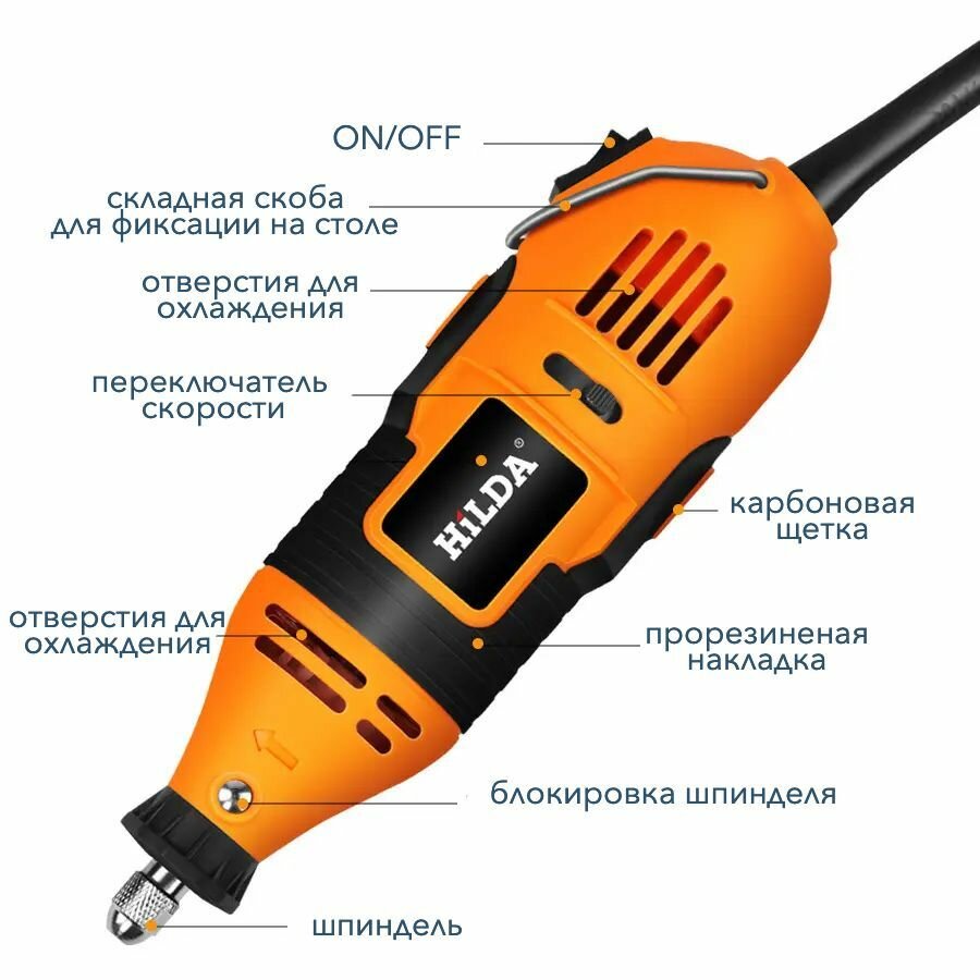 | Комплектация | 210 насадок + гибкий вал |