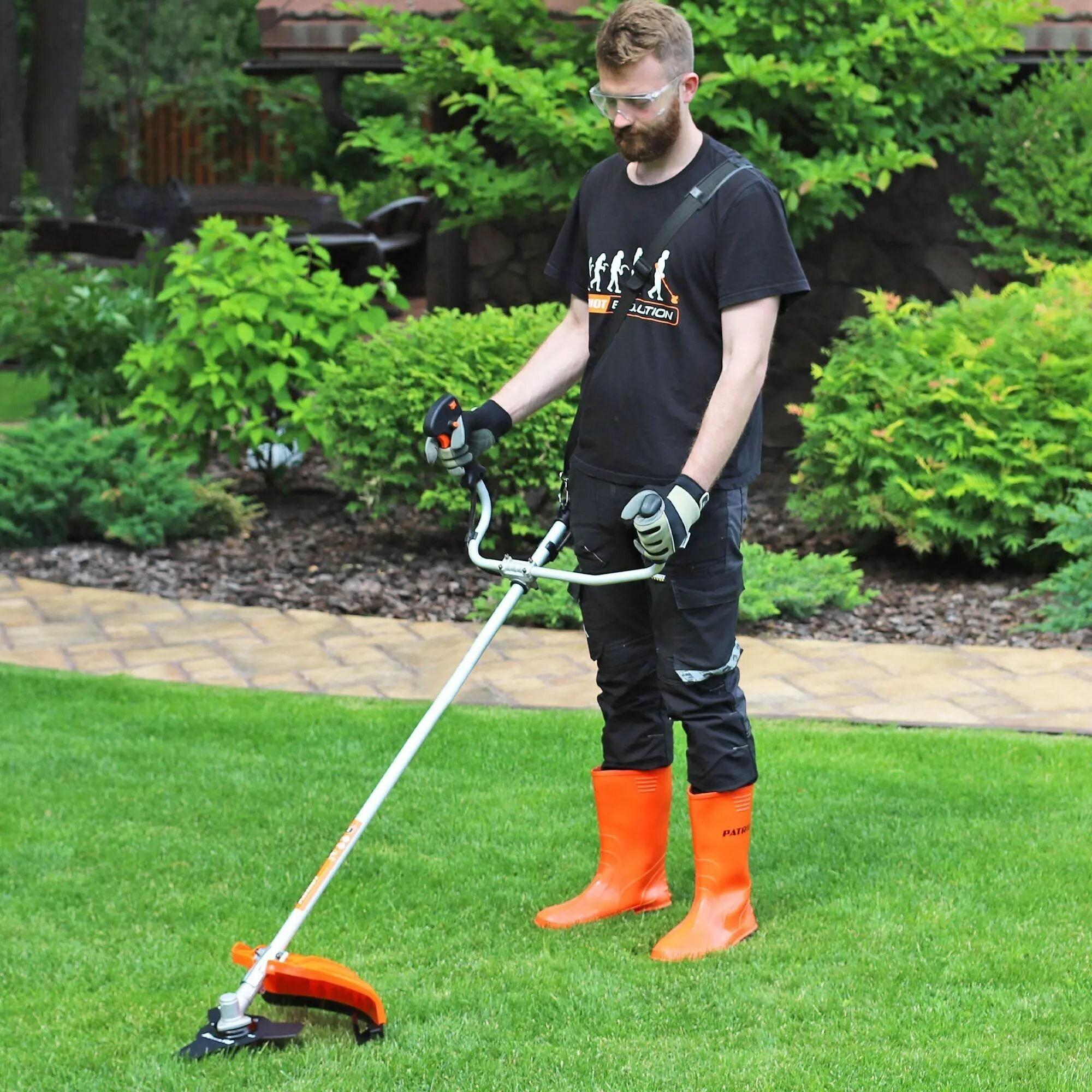 | Плюсы: | Работает тише чем двухтактный, не надо смешивать бензин с маслом, заводишь с пол тычка, меньше вибрации при кошении на руки |