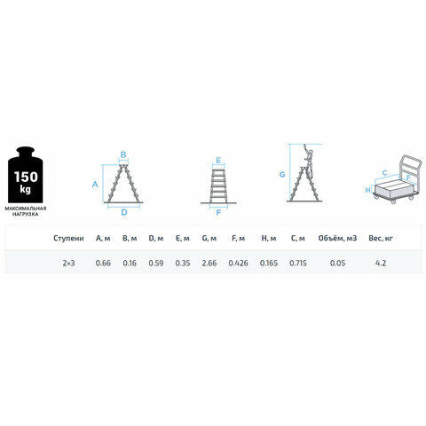 СохранитьСтремянка стальная двухсторонняя 2х3 ступени, высота площадки 0.66м, алюминиевая площадка 35*16см, до 150кг, вес 4.2кг новая высота, 1160203 интересное: