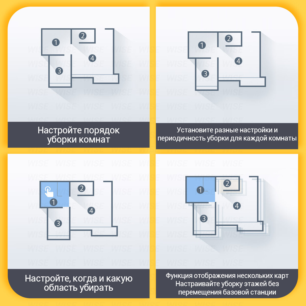 быстрая уборка / движение вдоль стен / местная уборка / турборежим / уборка по заданному маршруту