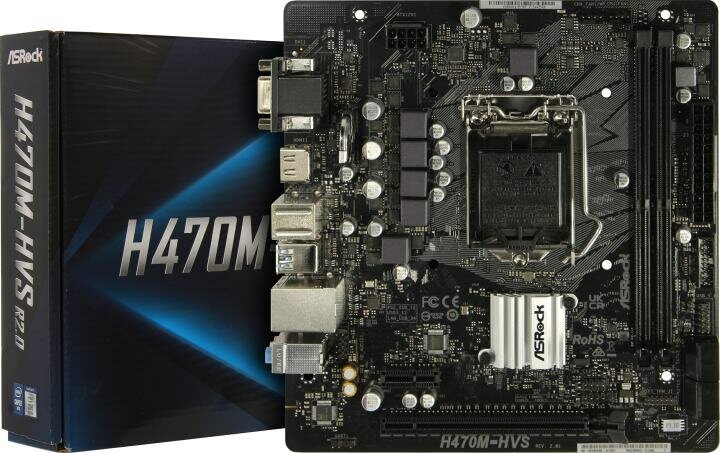 Материнская плата ASRock H470M-HVS R2.0 (LGA1200/H410/2xDDR4/1xPCI-Ex16/2xPCI-Ex1/SB7.1/GLAN/D-Sub/DVI/HDMI/mATX) RET