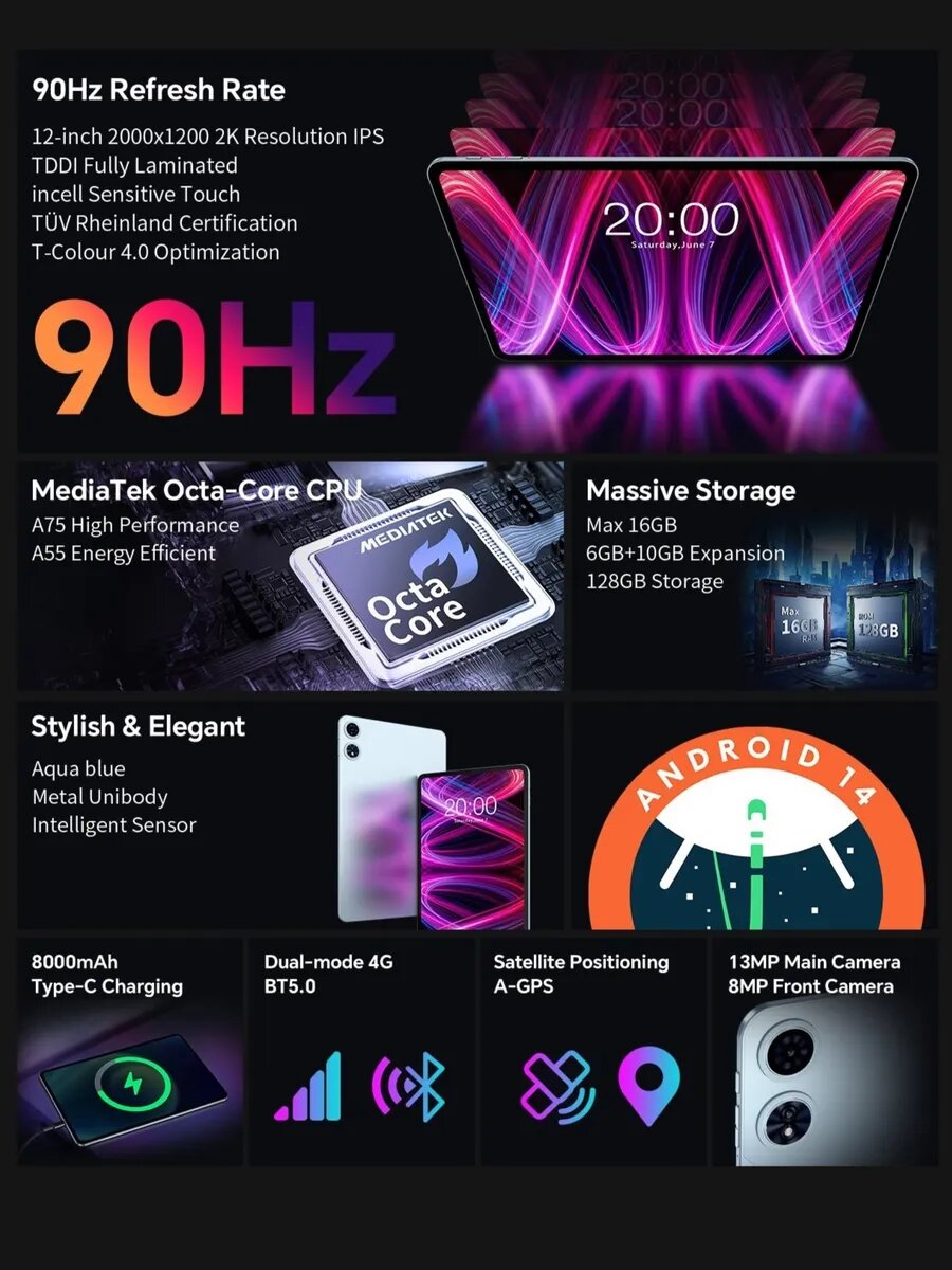 Планшет Teclast T606 M50, 128GB, 6GB 128G, 90 Гц, IPS, Wi-FI, Android 14, голубой
