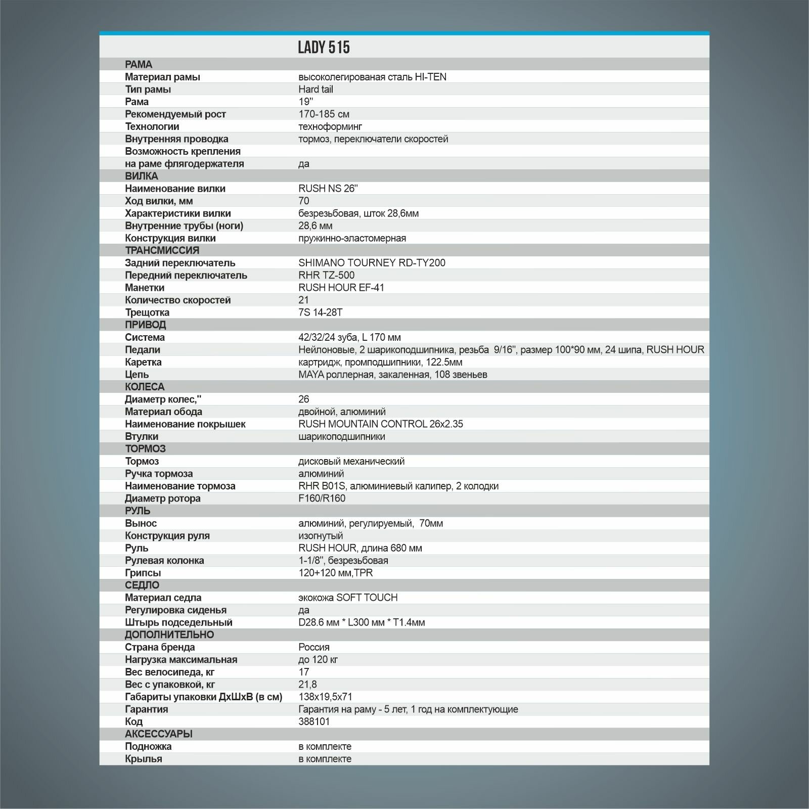 | Диаметр колес | 26 дюйм |